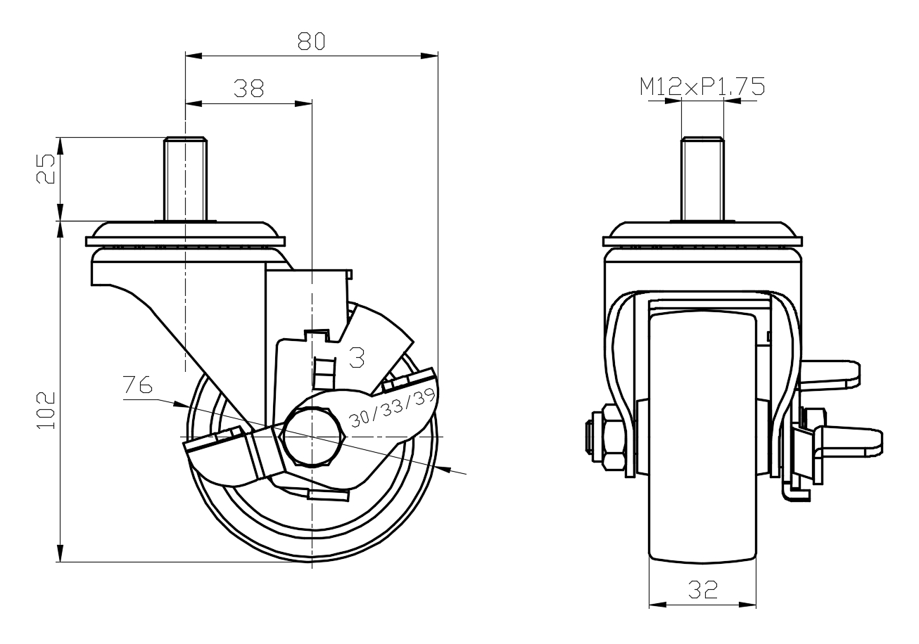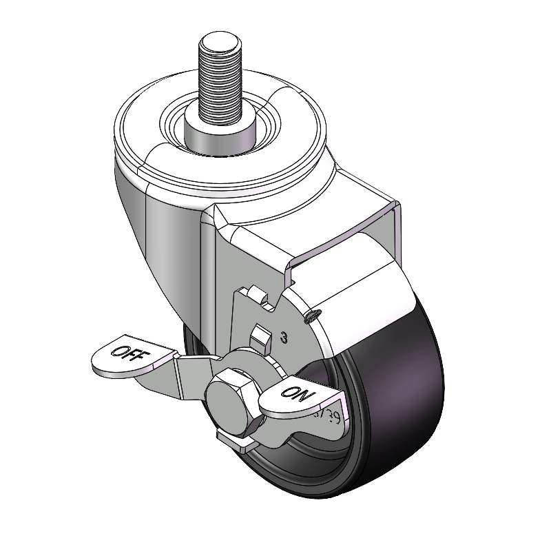 | Side Brake Locking system. Threaded Riveted Stamping Fork - M12-P1.75 Extended control lever surface, Mounting Type - Threaded Stem device Reinforced Polypropylene and Wheel Tread Wheels - Plain Bearing |