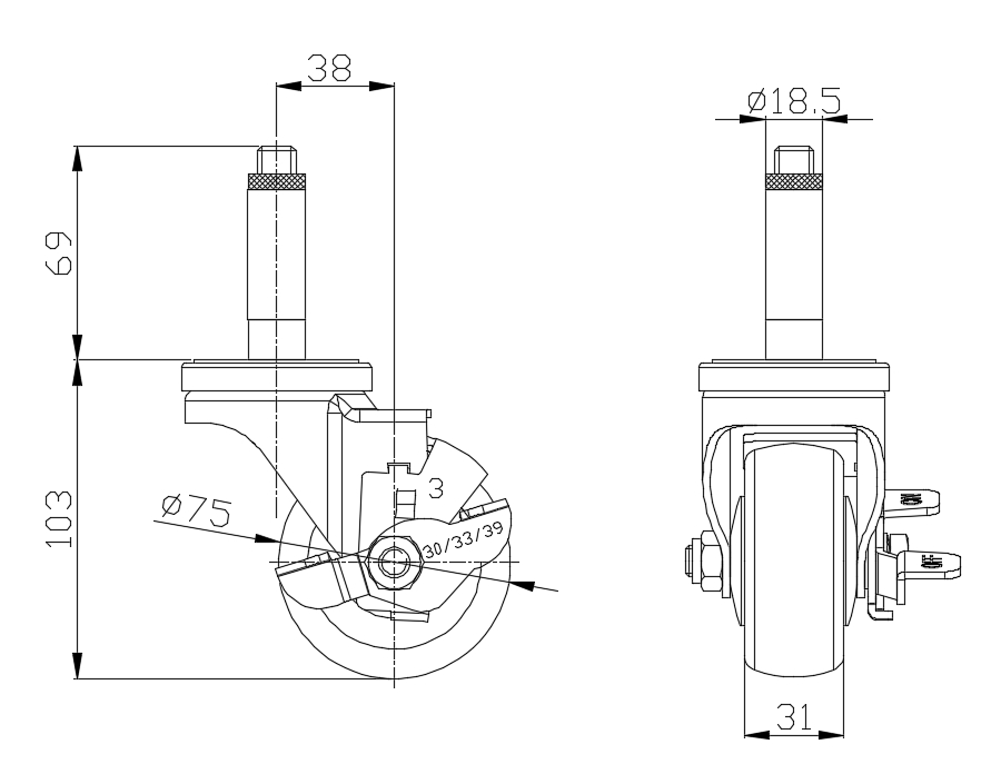 Casters with Side Brakes and With locking system. Threaded Stem Riveted Pressed Fork – 1/2"-13"