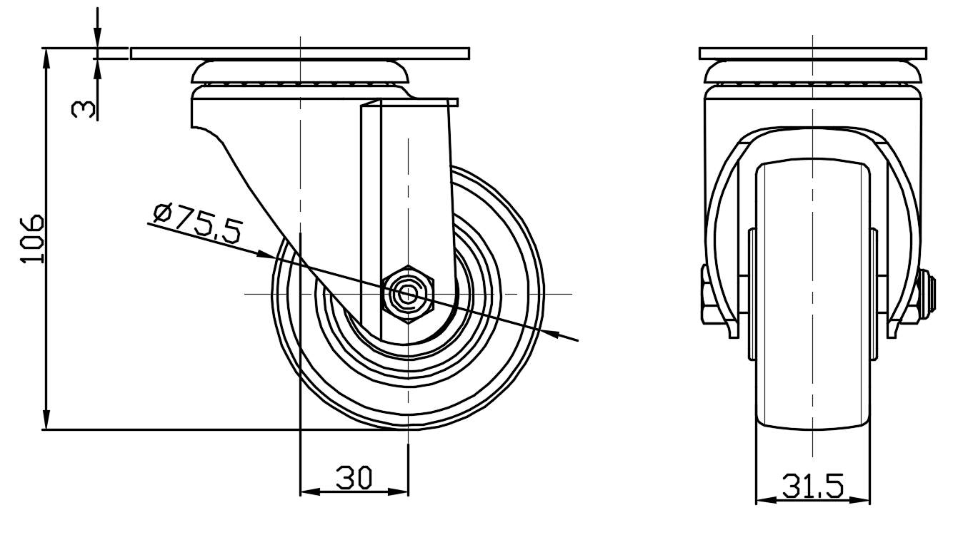 Swivel Caster with Riveted Fork and Stamping Fork—75 x 45 mm (3" x 1-3/4") Bolt Hole Spacing