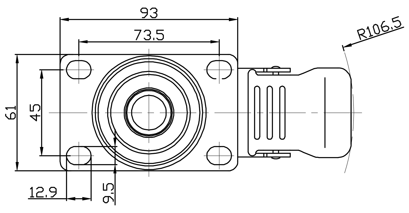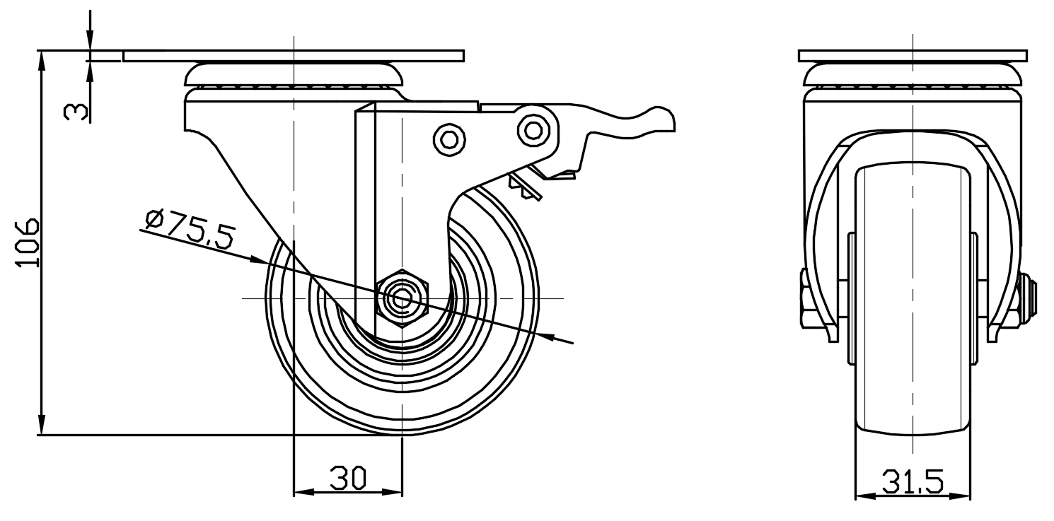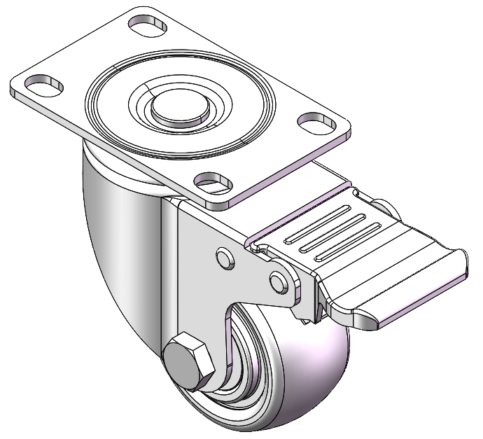 Casters with Total Brakes and a With locking system. Top Plate with Riveted, Stamping Fork and 75 x 45 mm (3" x 1-3/4") Bolt Hole Spacing.