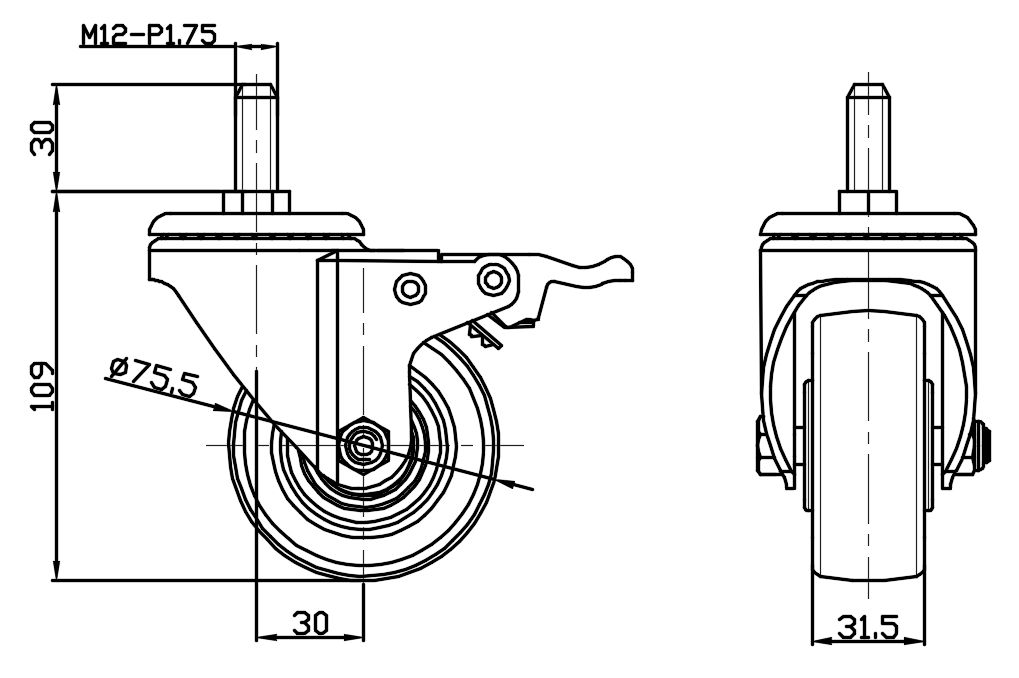 Casters with Total Brakes and With locking system. Threaded Stem Riveted Pressed Fork—M12-