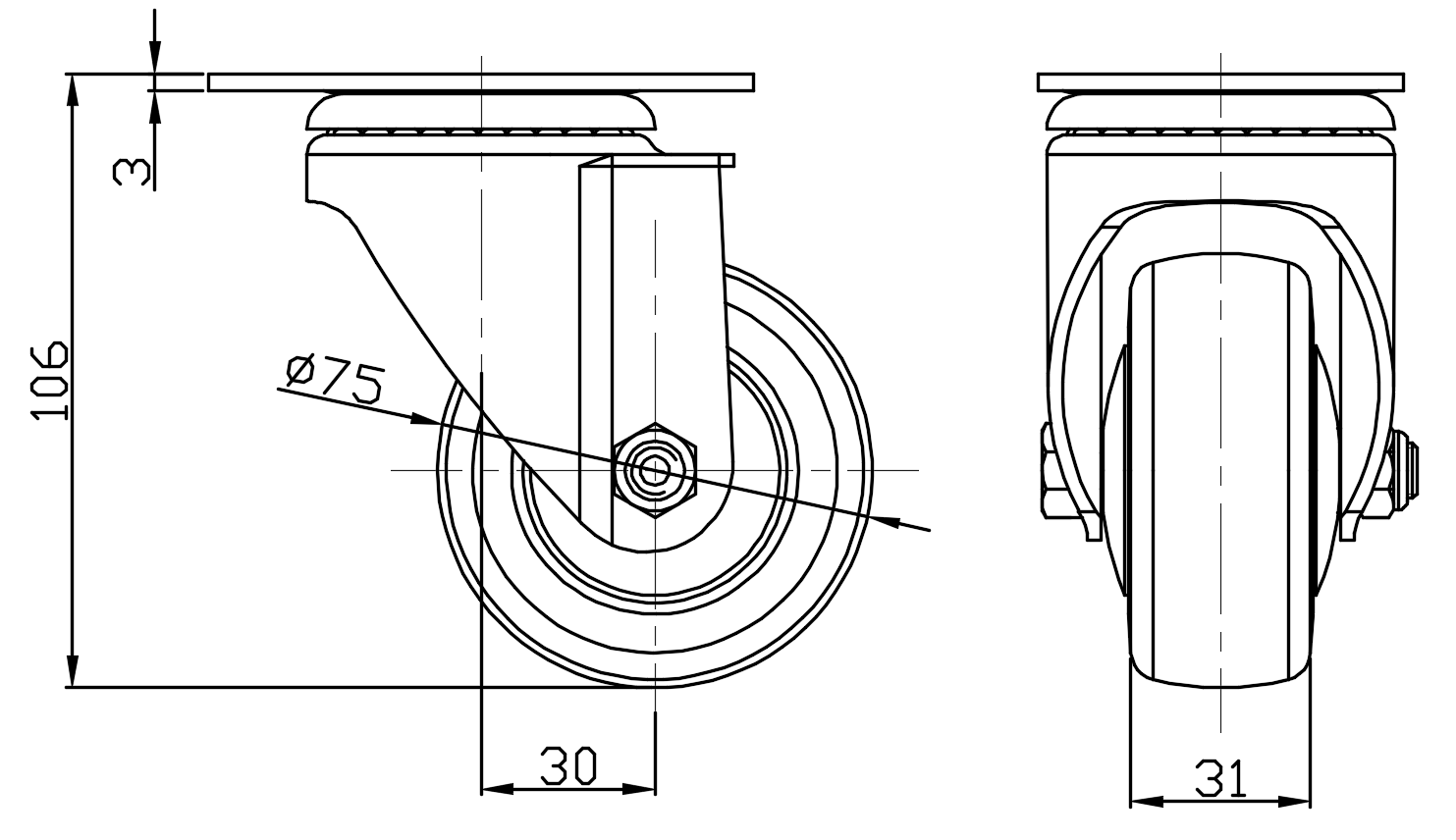 Swivel Caster with Riveted Fork and Stamping Fork—75 x 45 mm (3" x 1-3/4") Bolt Hole Spacing