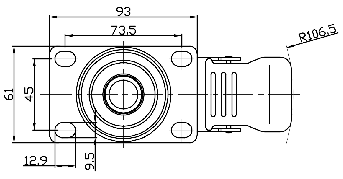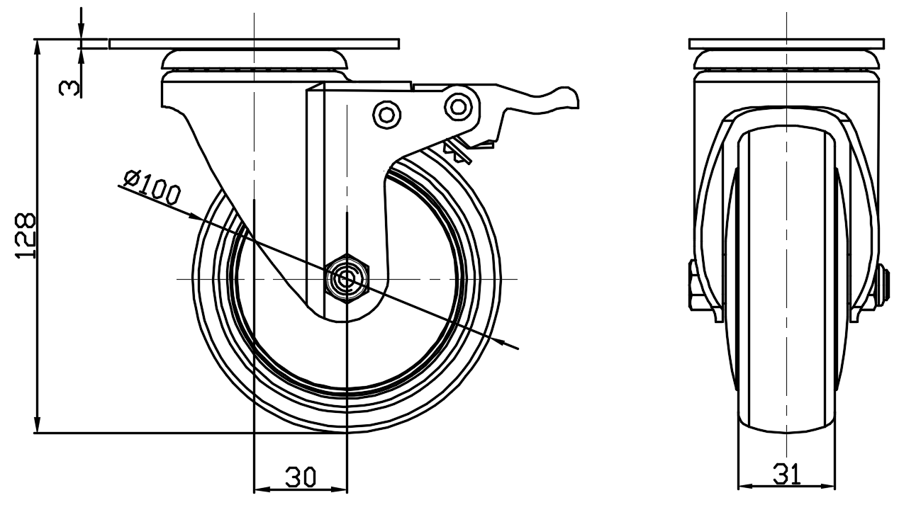 Casters with a Total Brake and With locking system. Top Plate with Riveted Fork and 75 x 45 mm (3" x 1-3/4") Bolt Hole Spacing.
