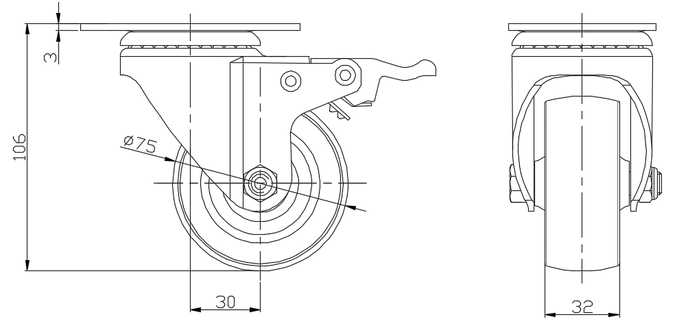 | Wheel tread: Thermoplastic (PA6) Wheel Center: Thermoplastic (PA6) Drawings are for reference only and may differ from the product |