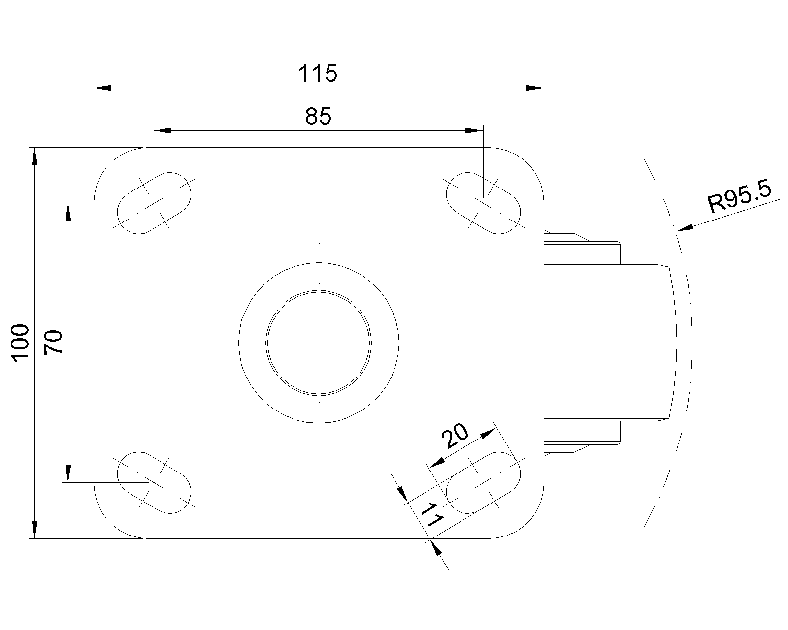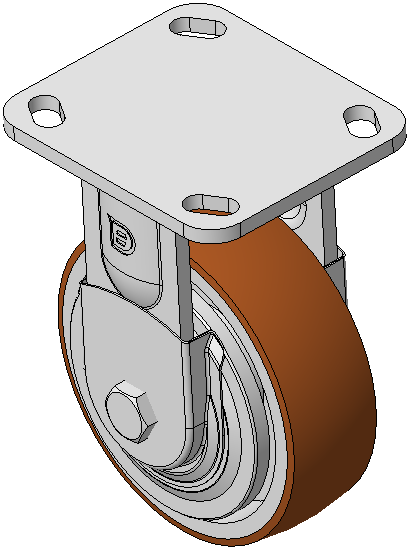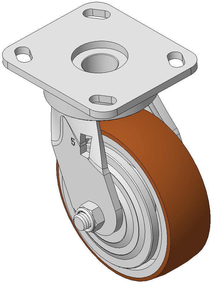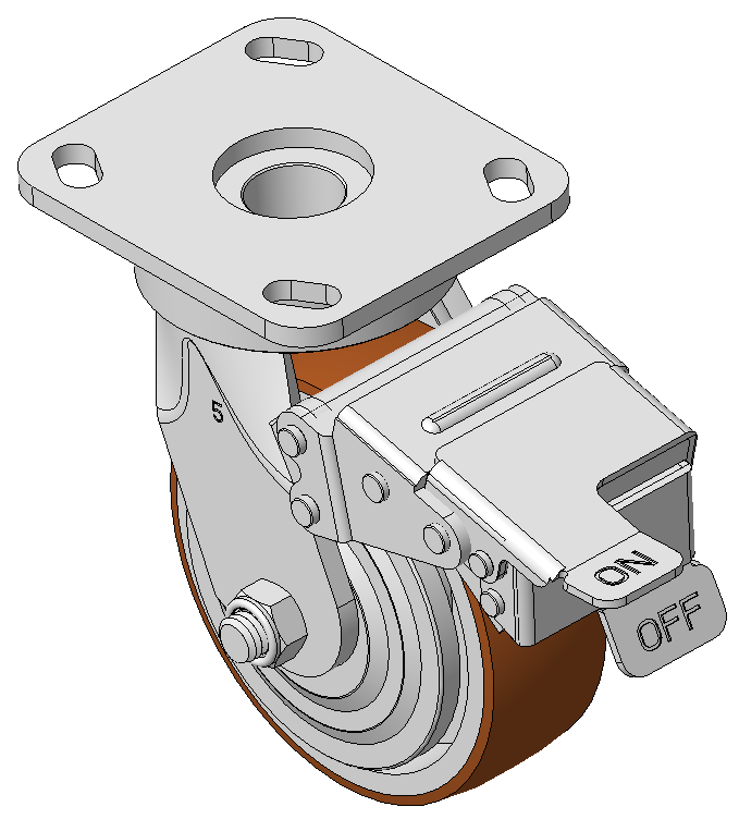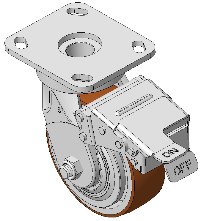 | Swivel castor, Welded Caster Fork Extended control lever surface, Top Plate Mounting Type, Hole spacing 85x70 Cast Iron Wheel Center, High Quality Polyurethane Wheel Tread, Cast Iron brown Bearing - Ball Bearing |