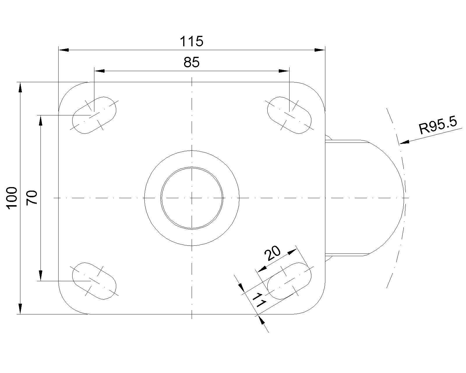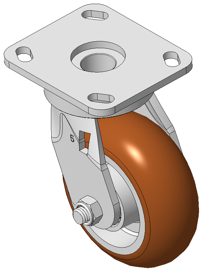 | Swivel castor, Welded Caster Fork Extended control lever surface, Top Plate Mounting Type, Hole spacing 85x70 Cast Iron Wheel Center, High Quality Polyurethane Wheel Tread, Cast Iron brown Bearing - Ball Bearing |