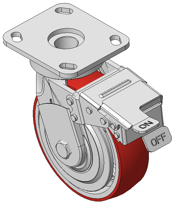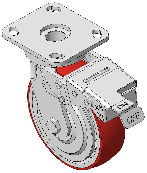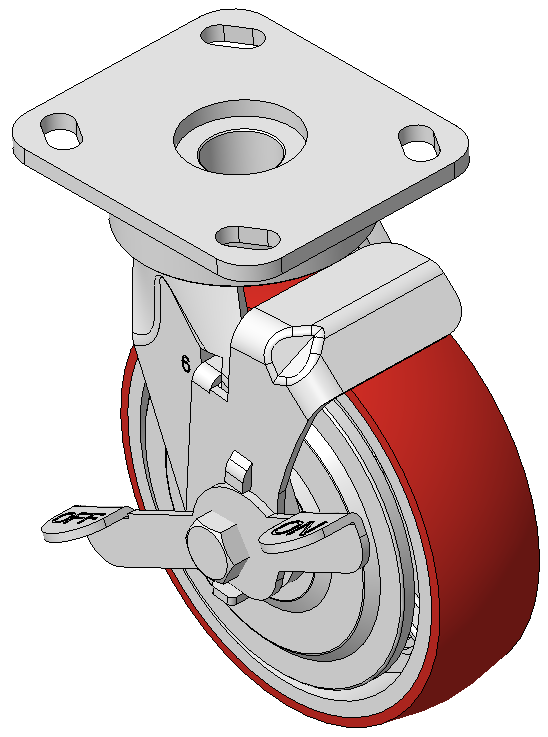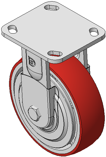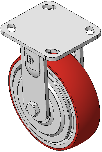 | Rigid Caster with Welded Caster Fork Zine-Plated, Mounting Type - Top Plate, 85x70 Bolt Hole Spacing Cast Iron Wheel Center with High Quality Polyurethane tread, Cast Iron red Bearing—Ball Bearing with special anti-wrap caps |