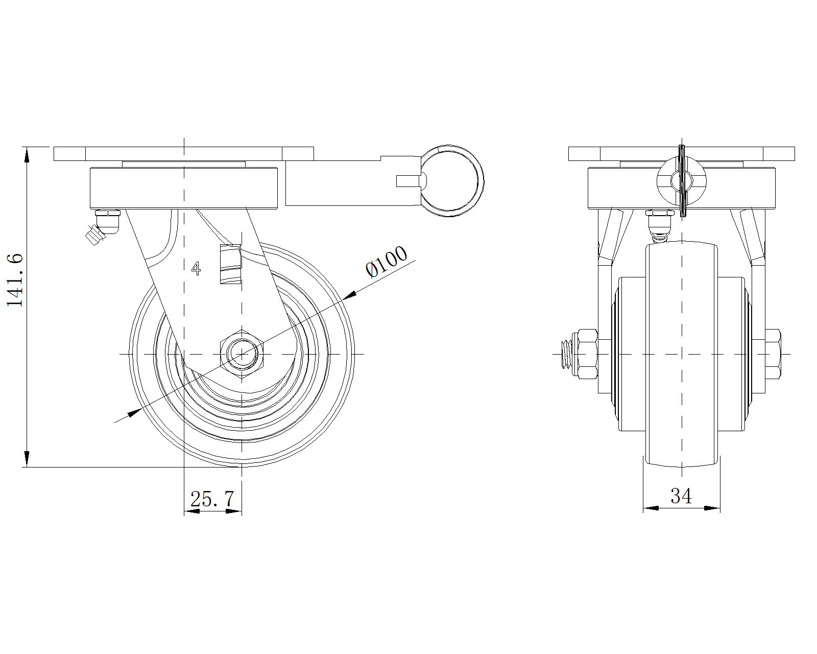 Plate Size 115 x 100mm Bolt Hole Spacing 85 x 70mm Plate Hole 20 x 11mm Offset 25.7mm Swivel Interference 268mm Overall Height 141.6mm Swivel Radius 134mm Hardness Of Tread 75±5° Shore D Load Capacity (Dynamic) 250kgs |