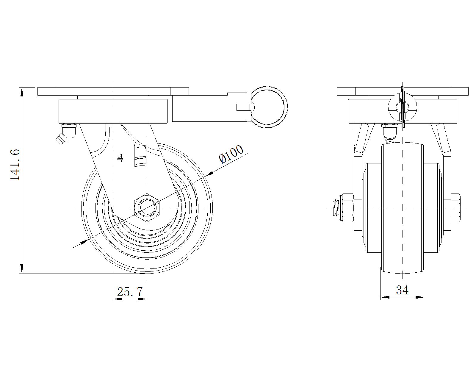 Plate Size 115 x 100mm Bolt Hole Spacing 85 x 70mm Plate Hole 20 x 11mm Offset 25.7mm Swivel Interference 268mm Overall Height 141.6mm Swivel Radius 134mm Hardness Of Tread 72±5° Shore D Load Capacity (Dynamic) 200kgs |