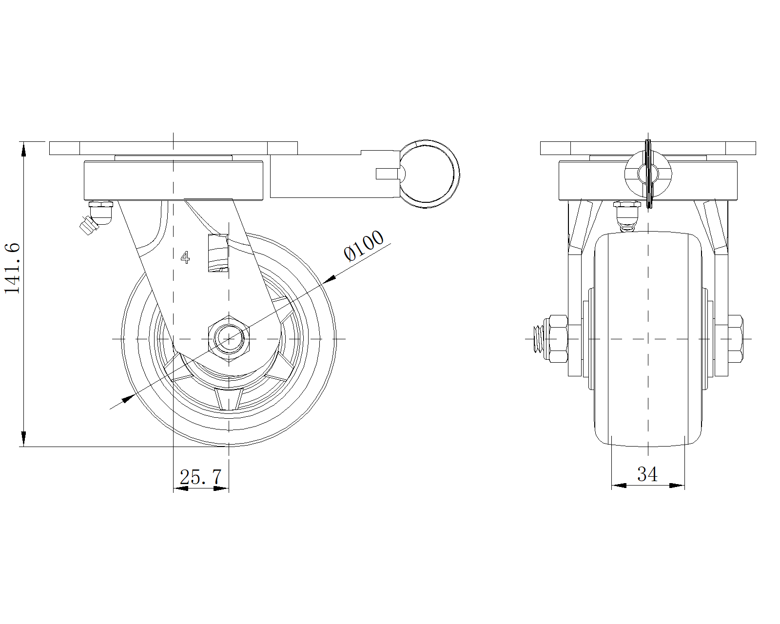 Plate Size 115 x 100mm Bolt Hole Spacing 85 x 70mm Plate Hole 20 x 11mm Offset 25.7mm Swivel Interference 268mm Overall Height 141.6mm Swivel Radius 134mm Hardness Of Tread 93±5° Shore A Load Capacity (Dynamic) 270kgs |