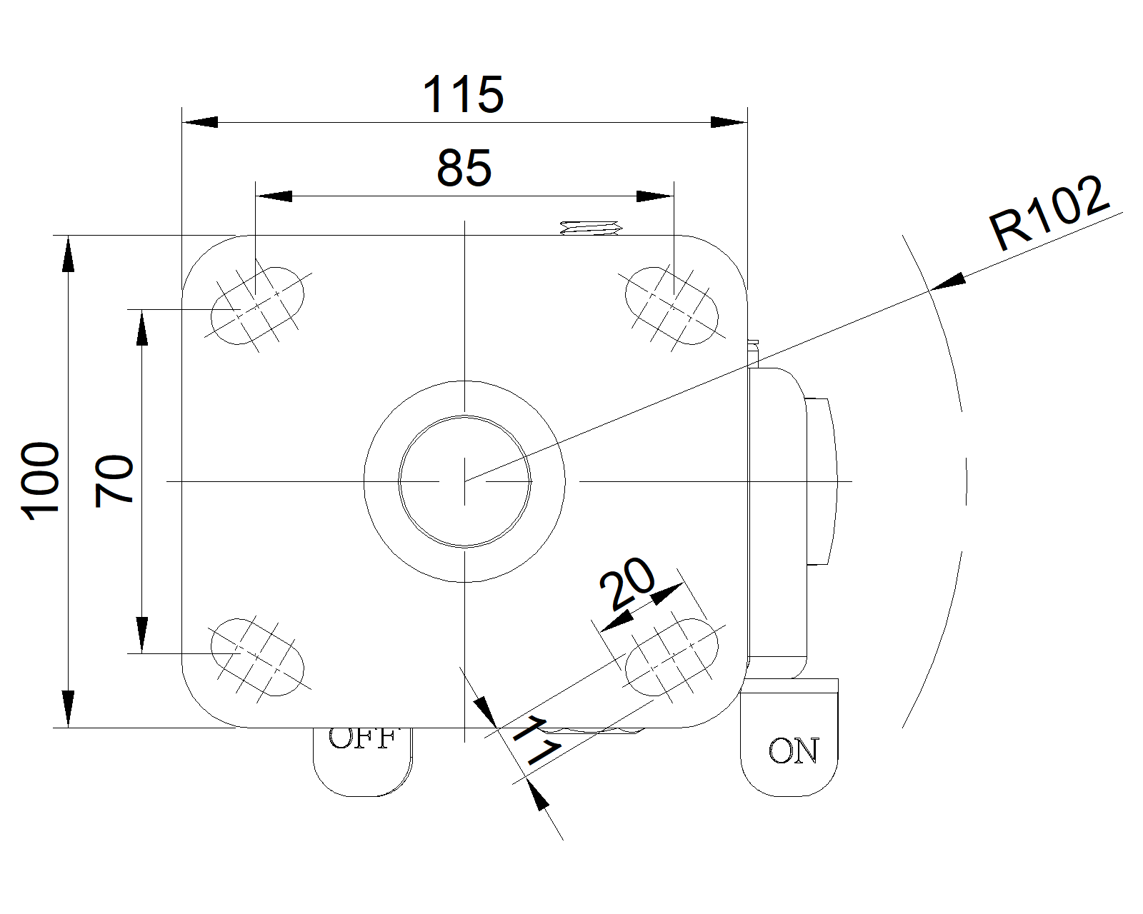 Plate Size 115 x 100mm Bolt Hole Spacing 85 x 70mm Plate Hole 20 x 11mm Offset 25.7mm Swivel Interference 204mm Overall Height 141.6mm Swivel Radius 102mm Hardness Of Tread 93±5° Shore A Load Capacity (Dynamic) 320kgs |