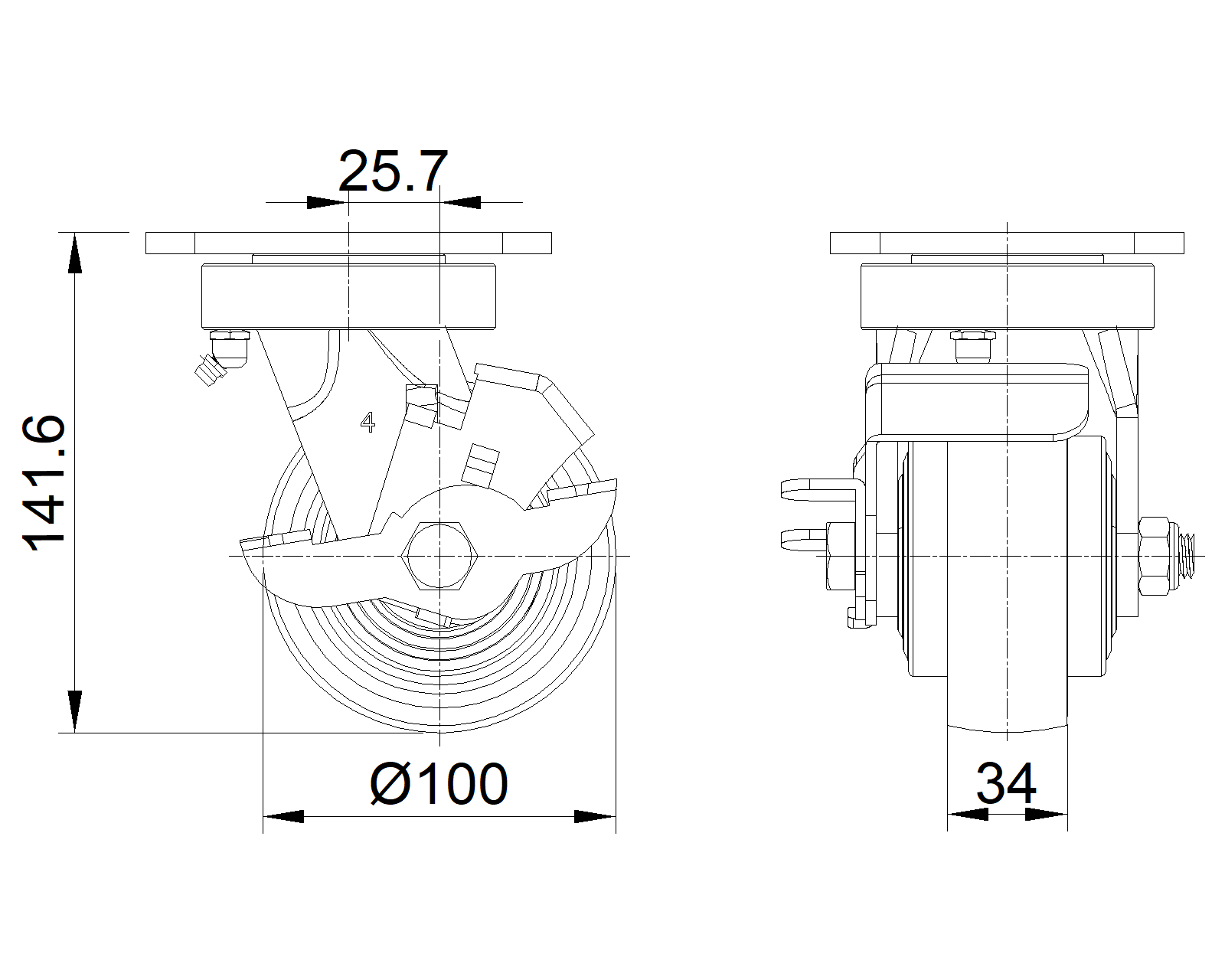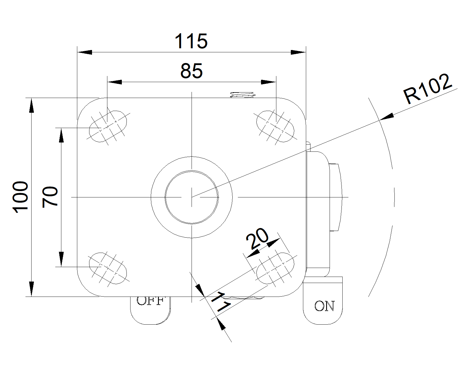 Plate Size 115 x 100mm Bolt Hole Spacing 85 x 70mm Plate Hole 20 x 11mm Offset 25.7mm Swivel Interference 204mm Overall Height 141.6mm Swivel Radius 102mm Hardness Of Tread 92±5° Shore A Load Capacity (Dynamic) 335kgs |