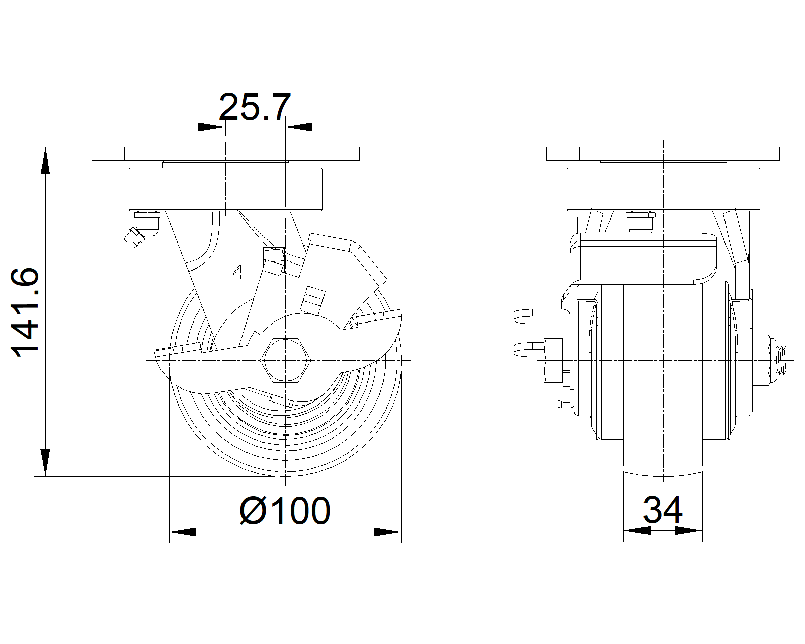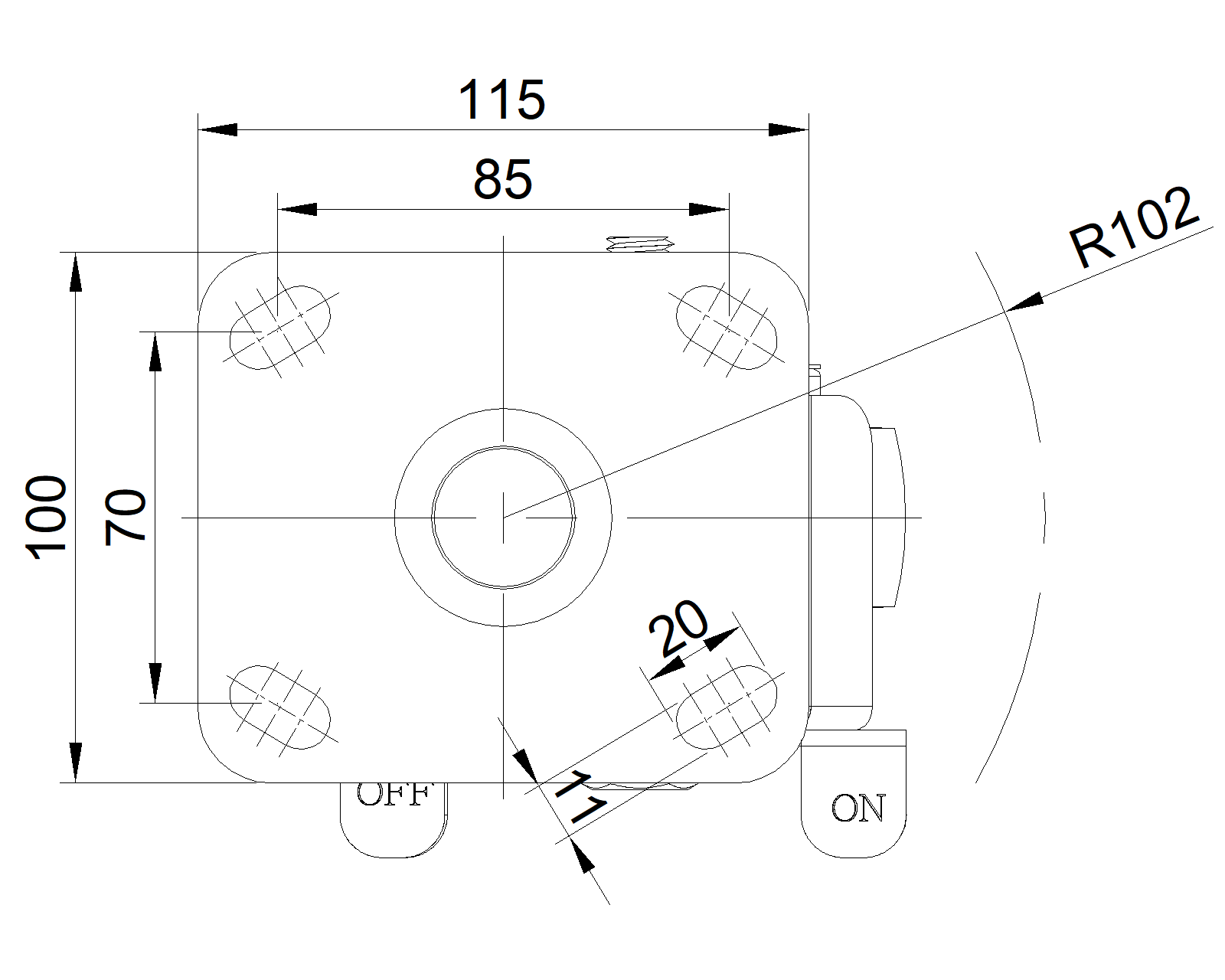 Plate Size 115 x 100mm Bolt Hole Spacing 85 x 70mm Plate Hole 20 x 11mm Offset 25.7mm Swivel Interference 204mm Overall Height 141.6mm Swivel Radius 102mm Hardness Of Tread 92±5° Shore A Load Capacity (Dynamic) 335kgs |