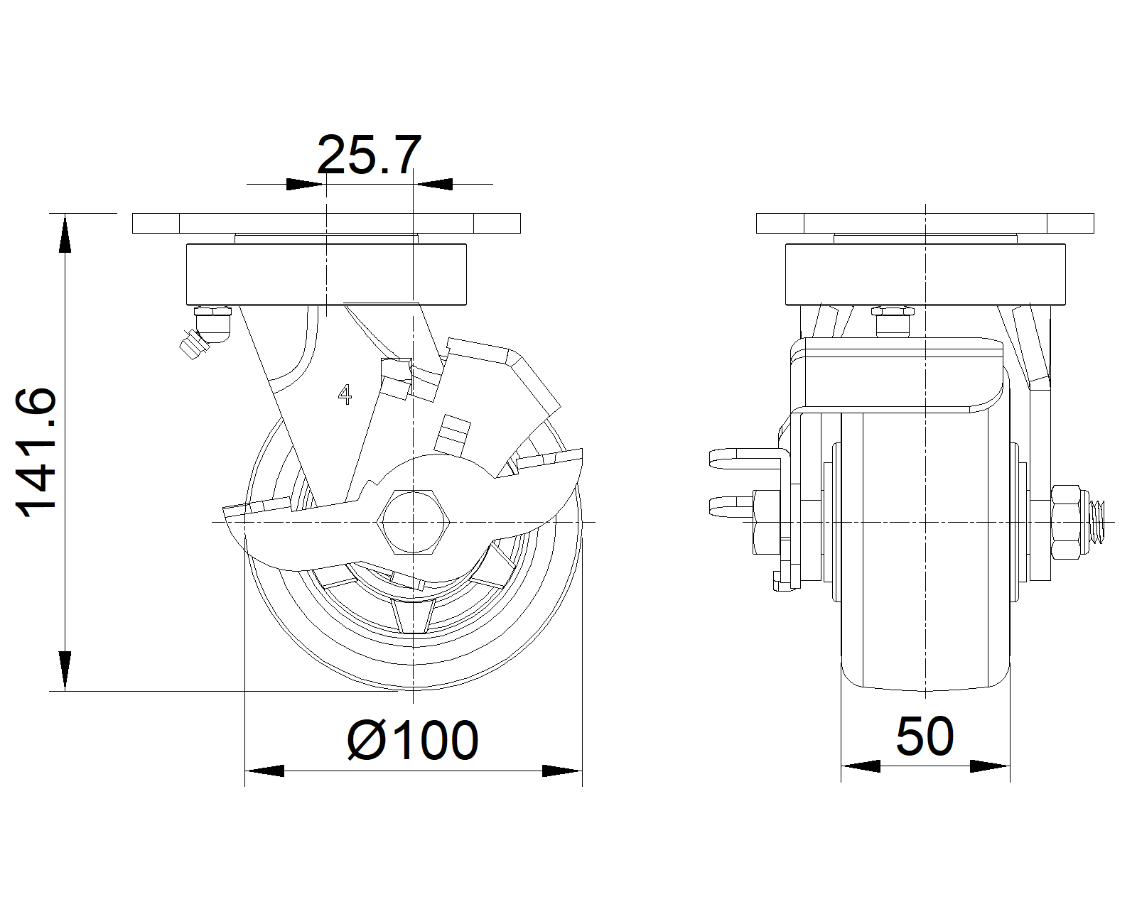 | Castors with side (wheel) brakes, Locking system, Welded Caster Fork Surface Zine-Plated, Top Plate Mounting Type, Hole spacing 85x70 Cast Iron Wheel Center, High Quality Polyurethane Wheel Tread, Cast Iron black and red Bearing - Ball Bearing |