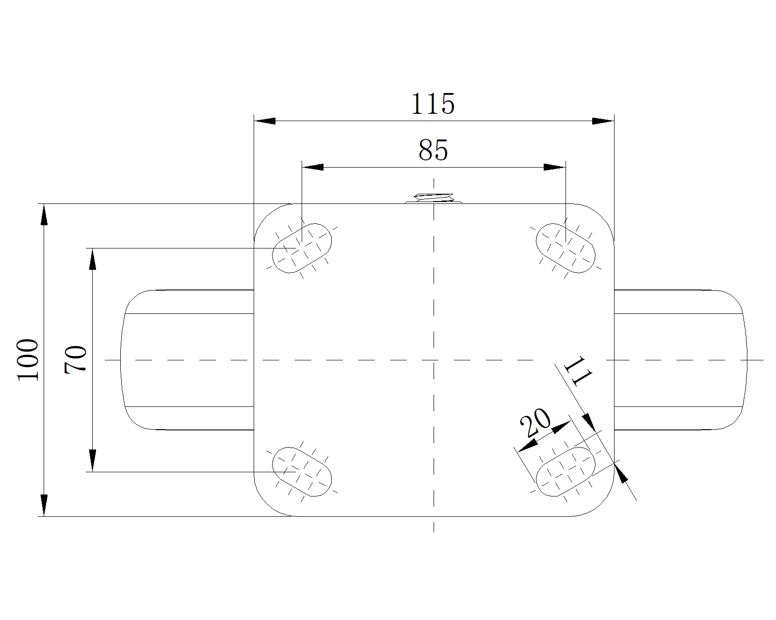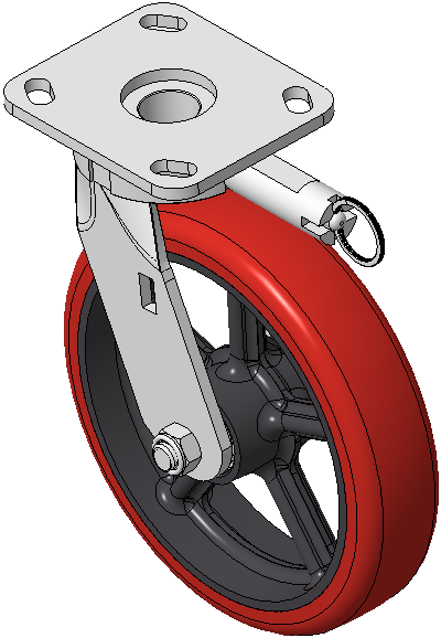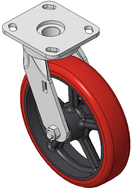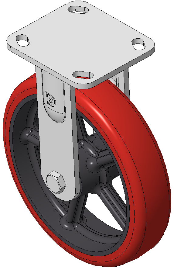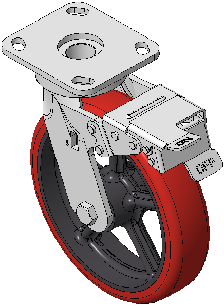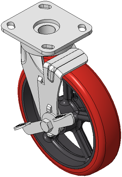 | Rigid castor, Welded Caster Fork Extended control lever surface, Top Plate Mounting Type, Hole spacing 85x70 Cast Iron Wheel Center, High Quality Polyurethane wheel tread, Cast Iron red Bearing - Ball Bearing |