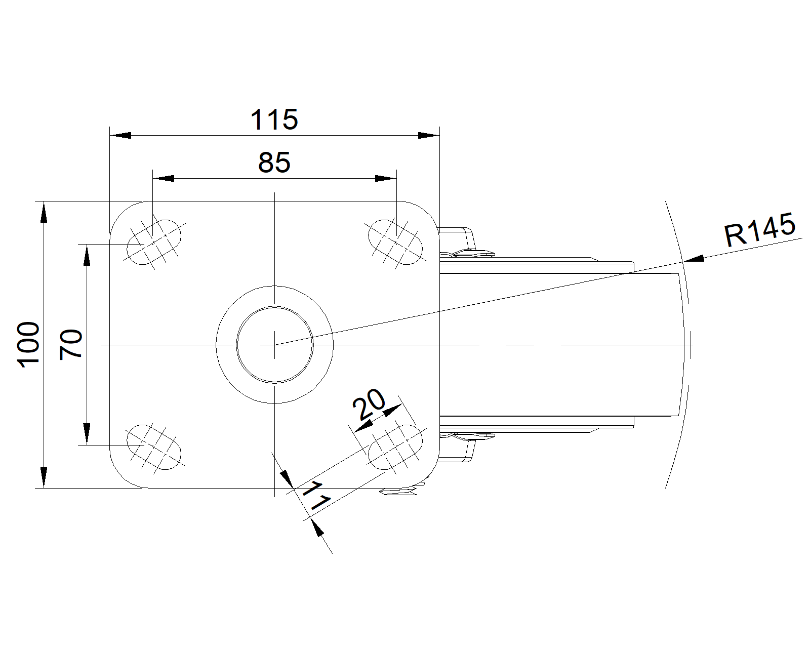 | Swivel Caster, Welded Caster Fork Extended control lever surface, Top Plate Mounting Type, Hole spacing 85x70 Cast Iron Wheel Center, High Quality Polyurethane Wheel Tread, Cast Iron brown Bearing - Ball Bearing, with special Anti-thread wheel cover |