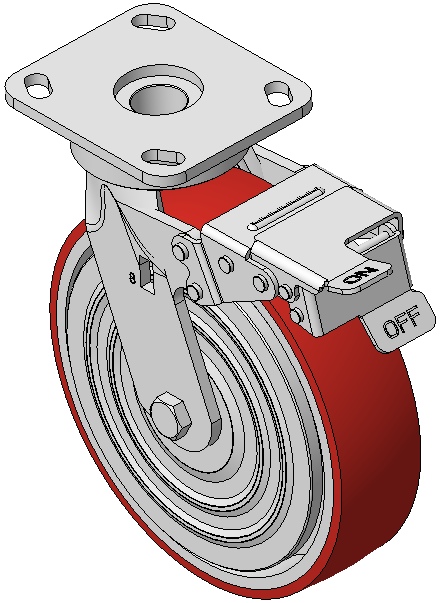 | Caster with Front Brake locking system, Welded Caster Fork Zine-Plated, Mounting Type - Top Plate, 85x70 Bolt Hole Spacing Cast Iron Wheel Center, High Quality Polyurethane tread, Cast Iron red Bearing—Ball Bearing |