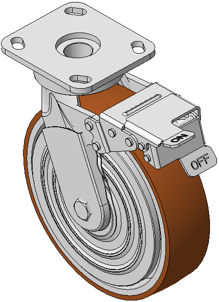 | Casters with Front Brake locking system, Welded Caster Fork Zine-Plated, Mounting Type - Top Plate, 85x70 Bolt Hole Spacing Cast Iron Wheel Center, High Quality Polyurethane tread, Cast Iron brown Bearing—Ball Bearing with special Anti-thread wheel cover |