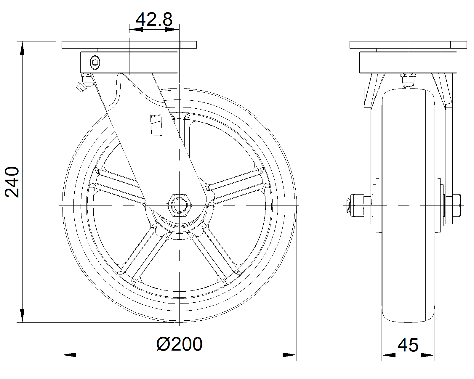 | PU Bánh xe (vòng cung đỏ) Đường kính bánh xe × Chiều rộng bánh xe 200 x 45mm |