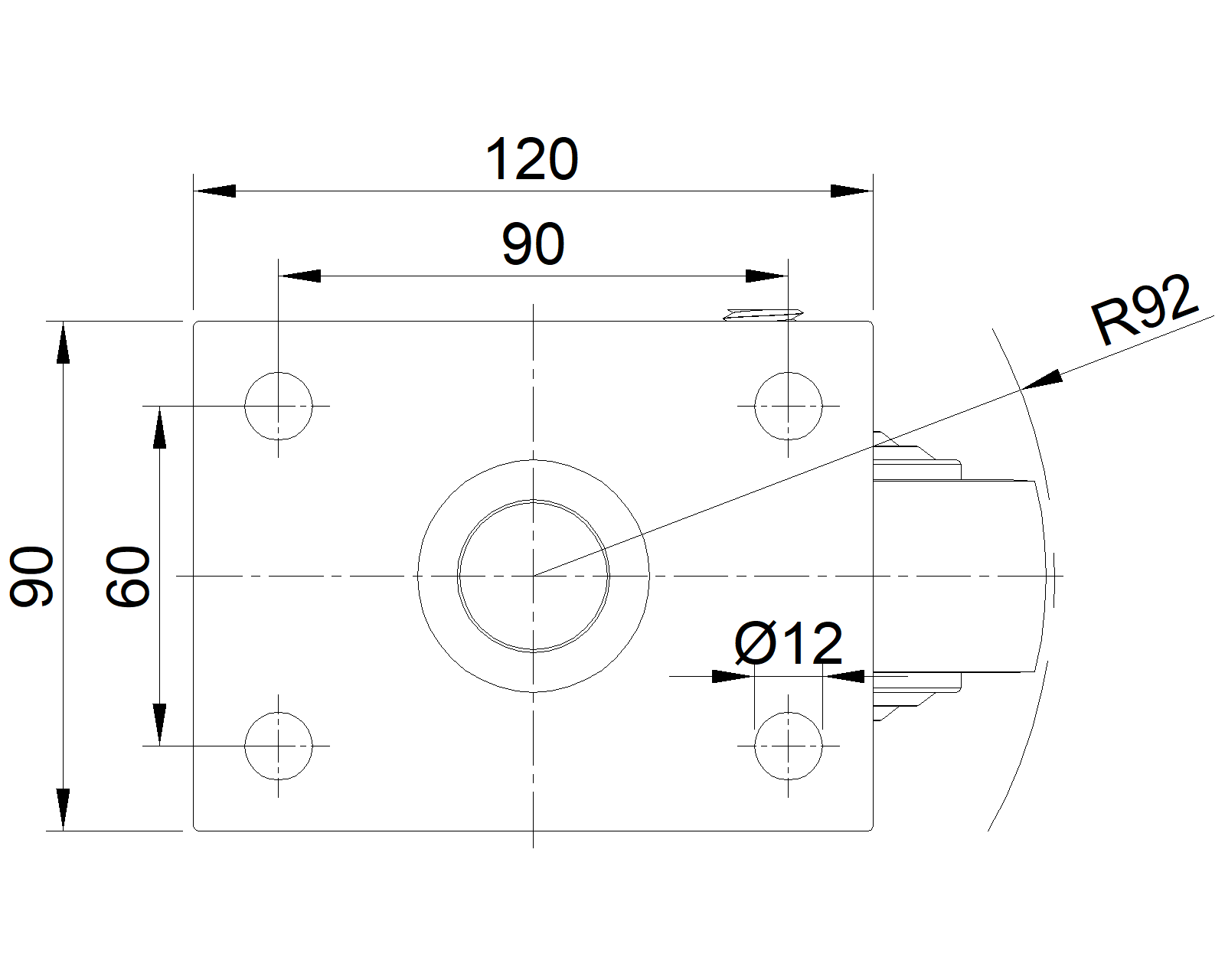 Plate Size 120 x 90mm Bolt Hole Spacing 90 x 60mm Plate Hole 12mm Offset 40.5mm Swivel Interference 184mm Overall Height 148.4mm Swivel Radius 92mm Hardness Of Tread 92±5° Shore A Load Capacity (Dynamic) 335kgs |