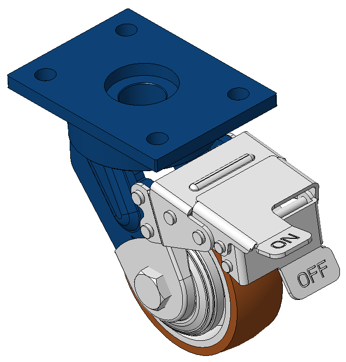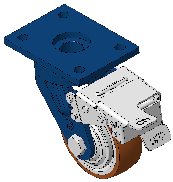 | Casters with front brake and With locking system, Welded Caster Fork Blue-painted finish, Mounting Type - Top Plate, 110x75 Bolt Hole Spacing Cast Iron Wheel Center, High Quality Polyurethane Wheel Tread, Cast Iron brown Bearings—Ball Bearings with special Anti-thread wheel cover |