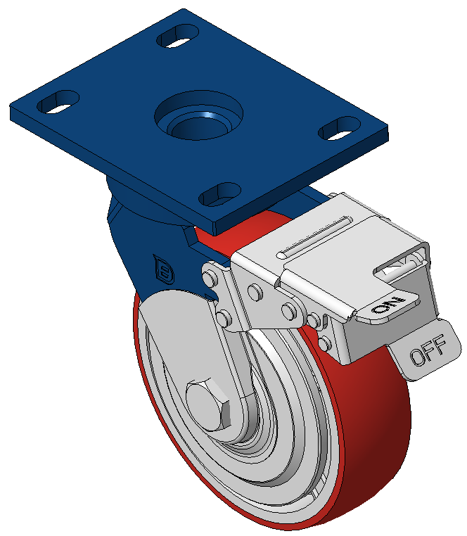 | Casters with front brake and With locking system, Welded Caster Fork Blue-painted finish, Mounting Type - Top Plate, 110x75 Bolt Hole Spacing Cast Iron Wheel Center, High Quality Polyurethane Wheel Tread, Cast Iron red Bearings—Ball Bearings with special Anti-thread wheel cover |