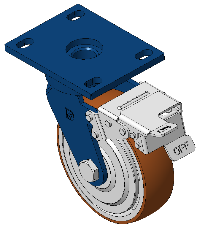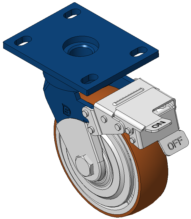 | Casters with front brake and With locking system, Welded Caster Fork Blue-painted finish, Mounting Type - Top Plate, 110x75 Bolt Hole Spacing Cast Iron Wheel Center, High Quality Polyurethane Wheel Tread, Cast Iron brown Bearings—Ball Bearings with special Anti-thread wheel cover |
