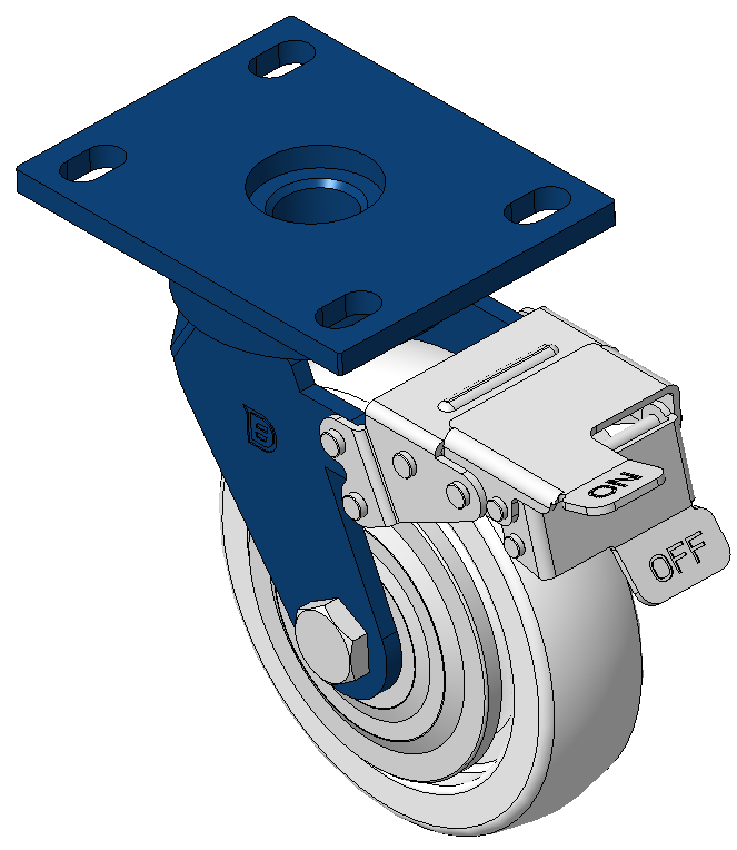 | Casters with front brake and With locking system, Welded Caster Fork Blue-painted finish, Mounting Type - Top Plate, 110x75 Bolt Hole Spacing Reinforced Polypropylene Wheel Center, natural Wheel Tread Bearings—Ball Bearings with special Anti-thread wheel cover |