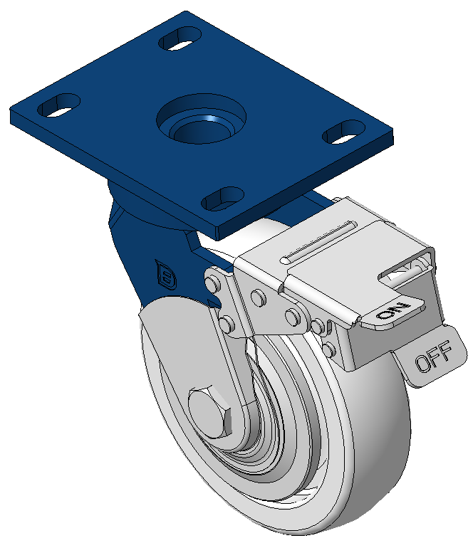 | Casters with front brake and With locking system, Welded Caster Fork Blue-painted finish, Mounting Type - Top Plate, 110x75 Bolt Hole Spacing Polypropylene Wheel Center, natural Wheel Tread Bearings—Ball Bearings with special Anti-thread wheel cover |