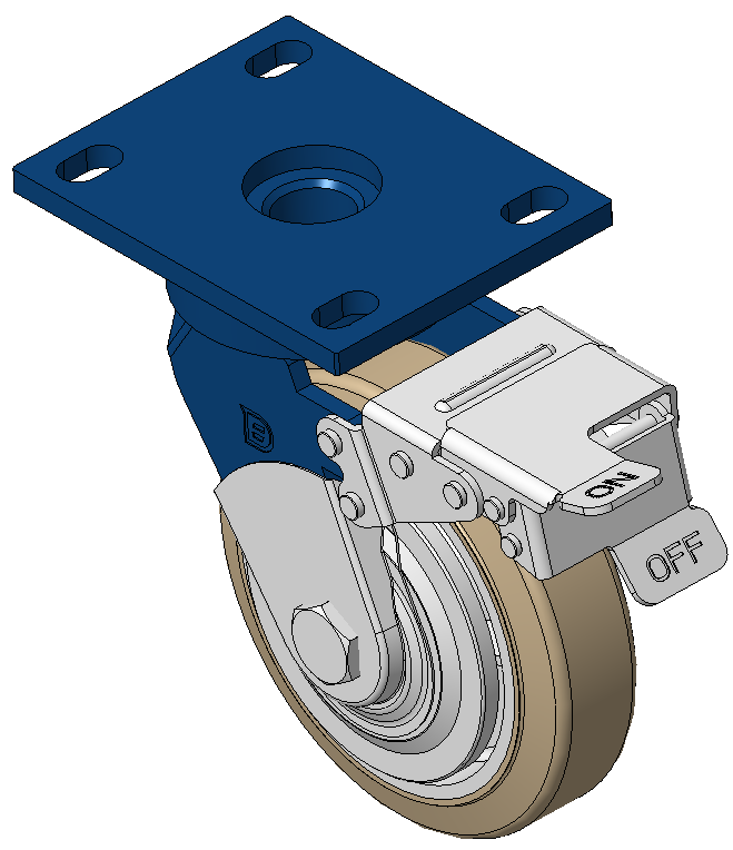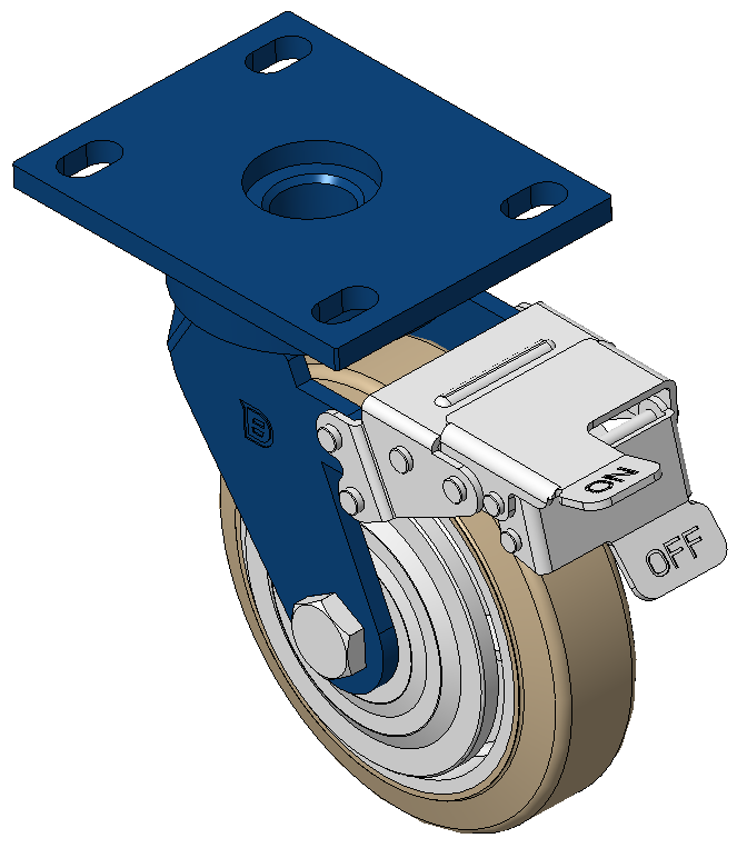 | Casters with front brake and With locking system, Welded Caster Fork Blue-painted finish, Mounting Type - Top Plate, 110x75 Bolt Hole Spacing Cast Iron core, High-Quality, highly Resilient Rubber Wheel Tread Cast Iron finish, Bearing—Ball Bearings |