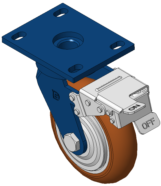 | Casters with front brake and With locking system, Welded Caster Fork Blue-painted finish, Mounting Type - Top Plate, 110x75 Bolt Hole Spacing Cast Iron core, High Quality Polyurethane Wheel Tread Cast Iron brown, Bearing—Ball Bearings |