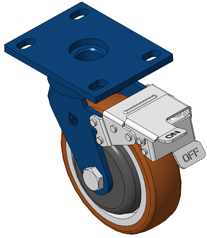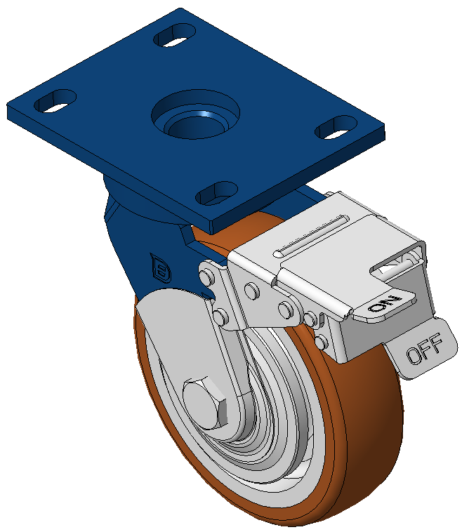 Casters with front brake and With locking system, Welded Caster Fork Blue painted finish, Mounting Type - Top Plate, 110x75 Bolt Hole Spacing Cast Iron Wheel Center, High Quality Polyurethane Wheel Tread, Cast Iron brown Bearings—Ball Bearings with special Anti-thread wheel cover |