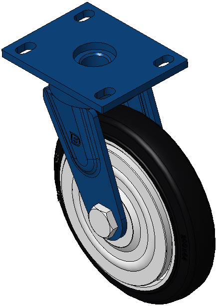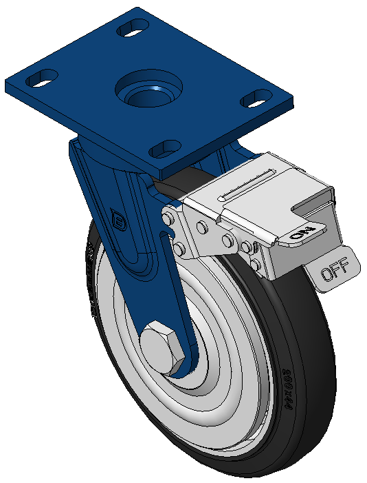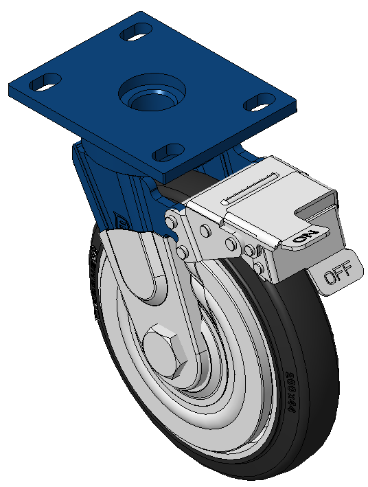 | Casters with front brake and With locking system, Welded Caster Fork Blue-painted finish, Mounting Type - Top Plate, 110x75 Bolt Hole Spacing Cast Iron core, High-Quality, highly Resilient Rubber Wheel Tread, Cast Iron black Bearings—Ball Bearings with special Anti-thread wheel cover |
