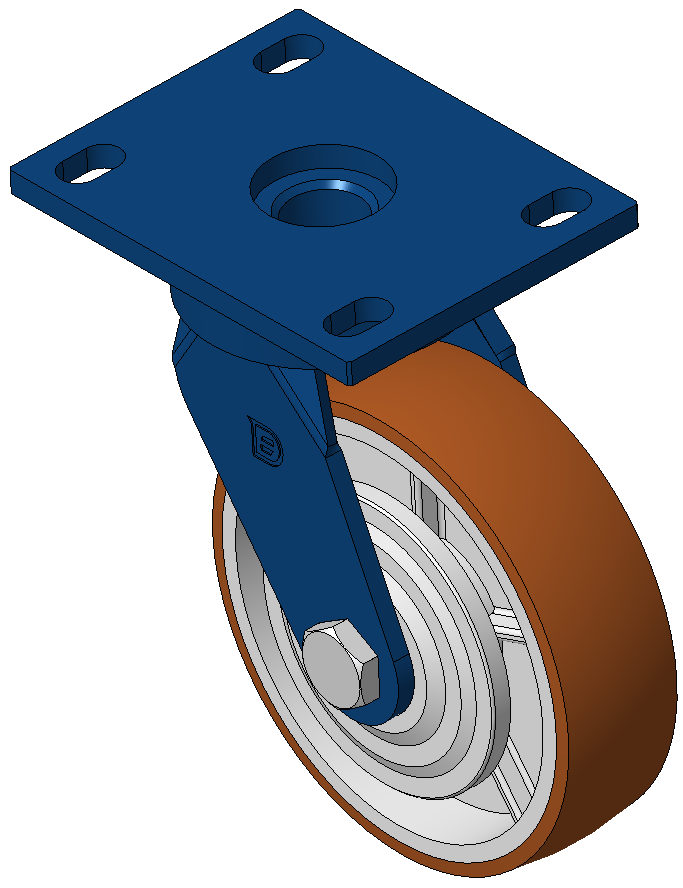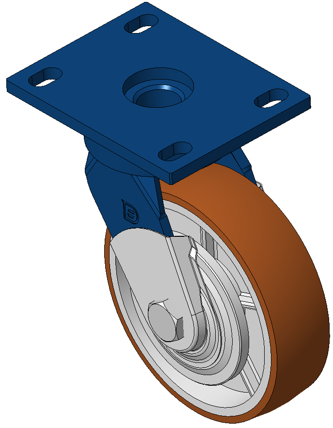 | Swivel Caster, Welded Caster Fork Surface sprayed with blue paint, Mounting Type - Top Plate, Hole spacing 85x70 Cast Iron Wheel Center, High Quality Polyurethane Wheel Tread, Cast Iron brown Bearing—Ball Bearing, with special Anti-thread wheel cover |