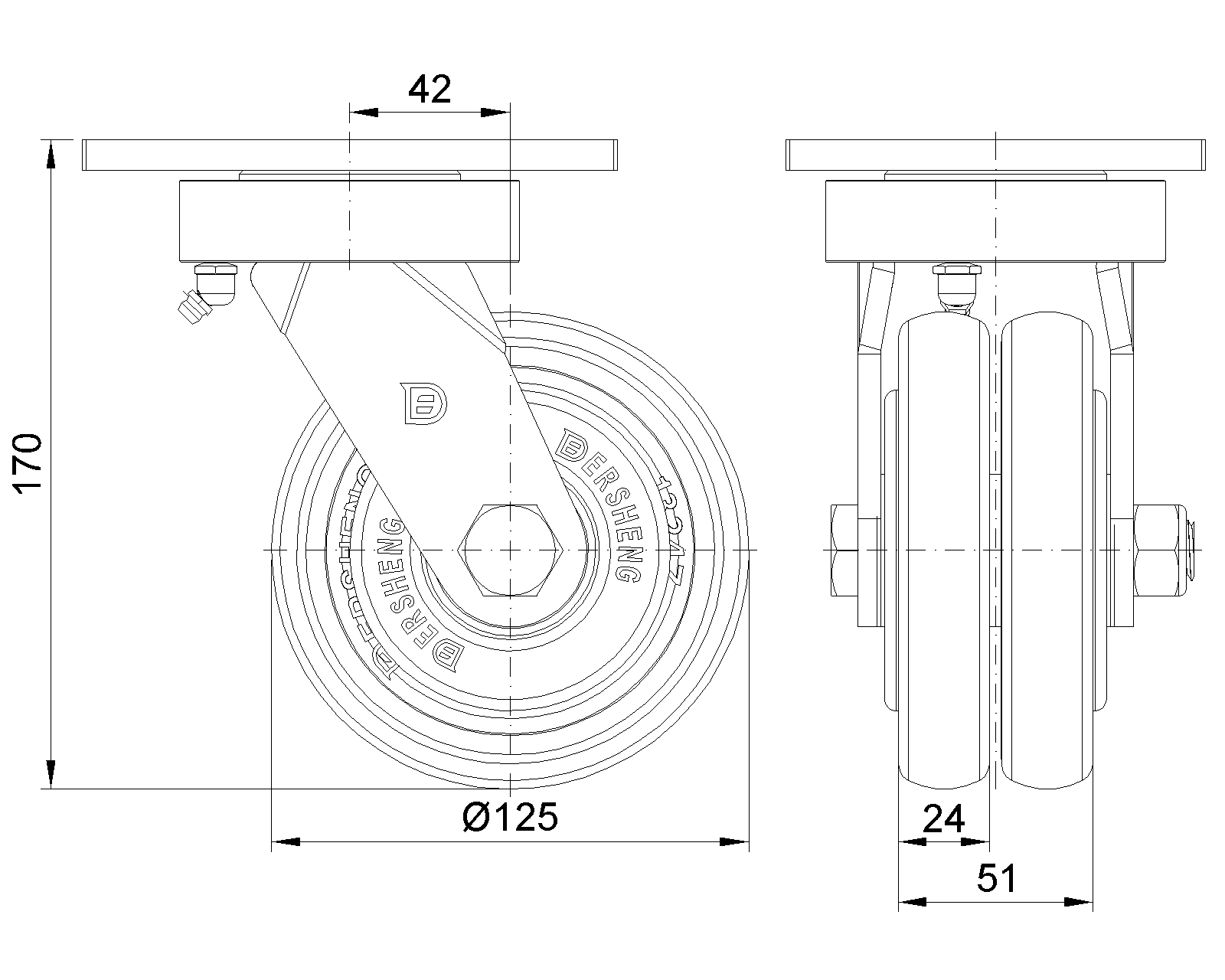 | Bánh xe ZQPU (hồ quang nâu) Đường kính bánh xe × Chiều rộng bánh xe 125 x 24 (51) mm |