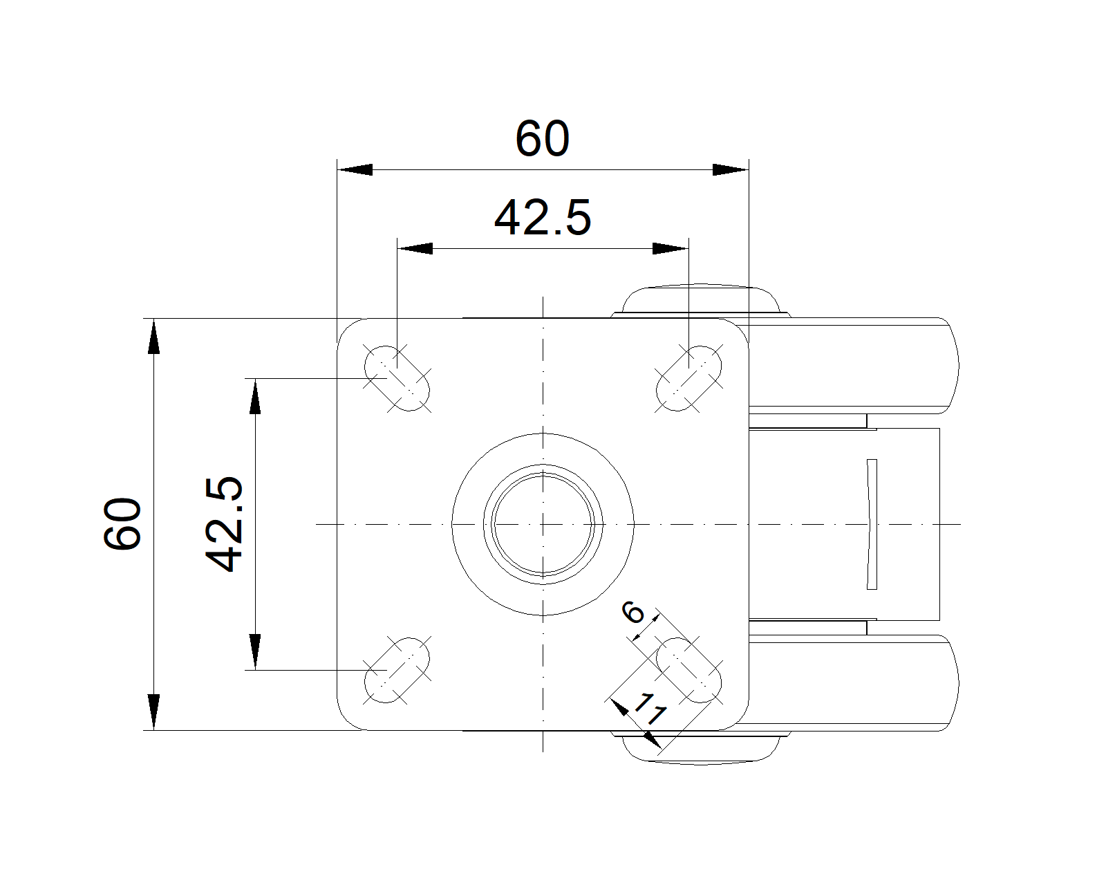Rigid Caster with 42.5 x 42.5 mm angled hole Fork