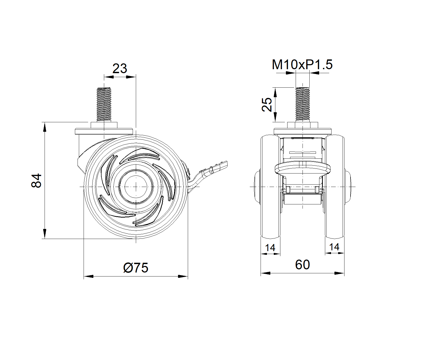 | Wheel tread: Thermoplastic rubber elastomer (TPR) Wheel Center: Made of high-quality impact-resistant polypropylene Drawings are for reference only and may differ from the product |