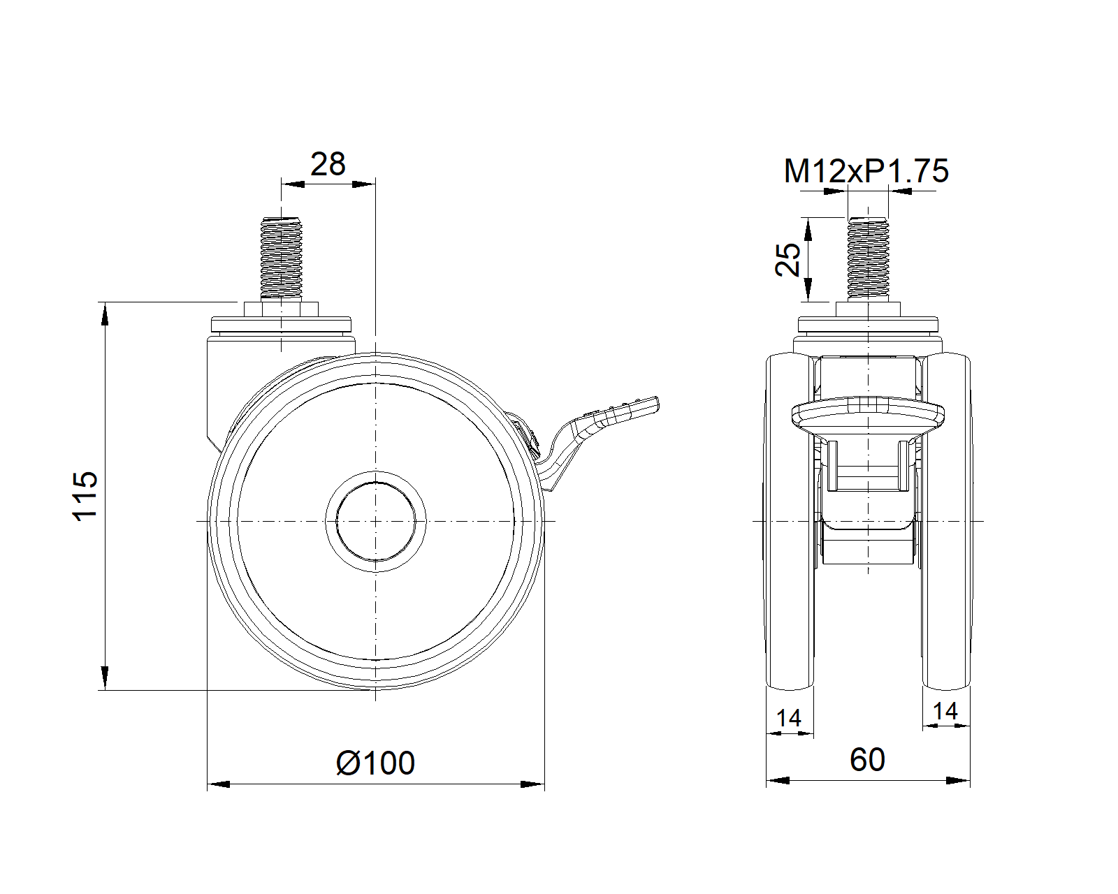 Long Total Brake Casters, Threaded Stem M12x25
