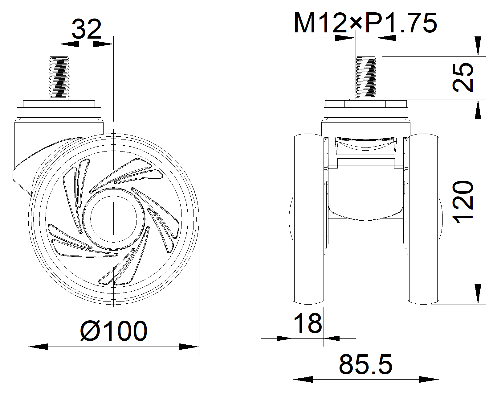 Threaded Stem M12 Threaded Length 25mm Offset 32mm Swivel Interference 182mm Overall Height 120mm Swivel Radius 91mm Hardness Of Tread 72±5° Shore A Load Capacity (Dynamic) 100kgs |