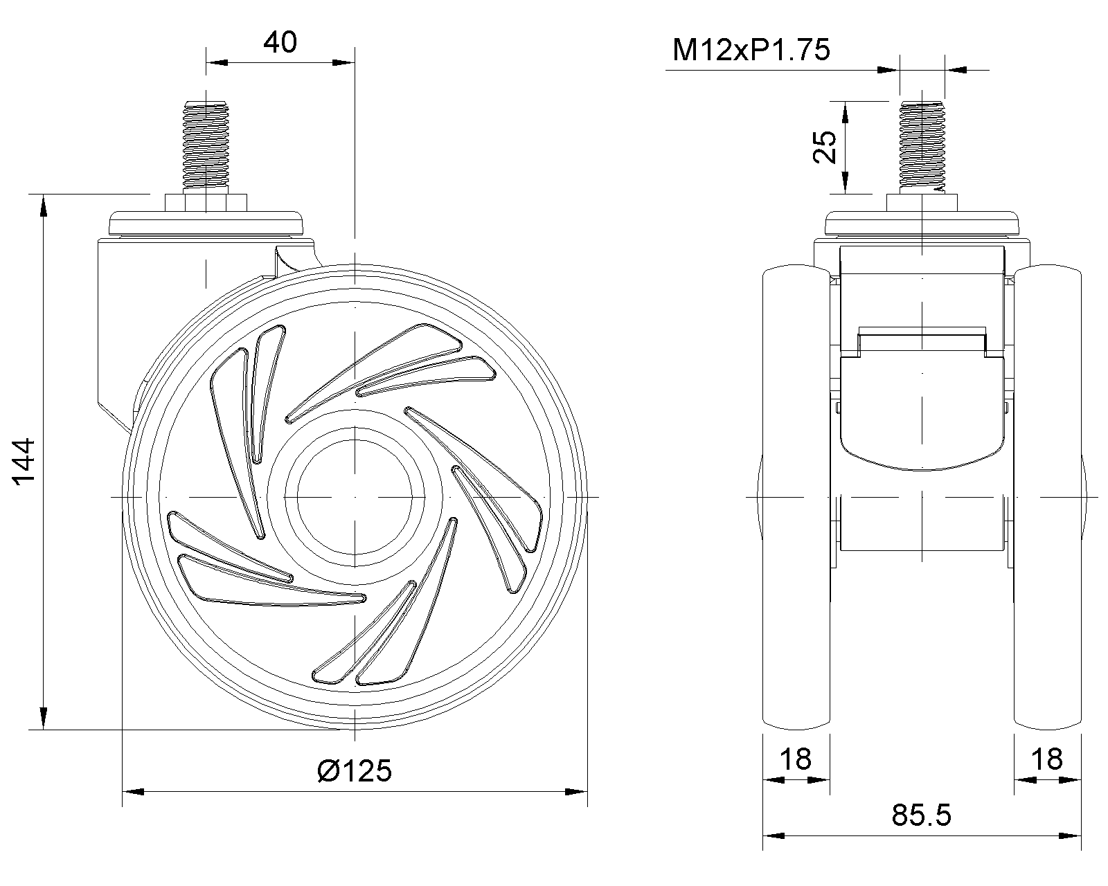 Actual Casters, Threaded Stem M12x25 White Caster Fork made of polyamide reinforced material Rust-proof, Corrosion resistant, Attractive appearance, Economical, and rotates smoothly High-Quality Impact-Resistant Polypropylene Wheel Center, High-Quality Reinforced Polypropylene Rubber (TPR) Wheel Tread Dark gray, Bearing—Ball Bearings |