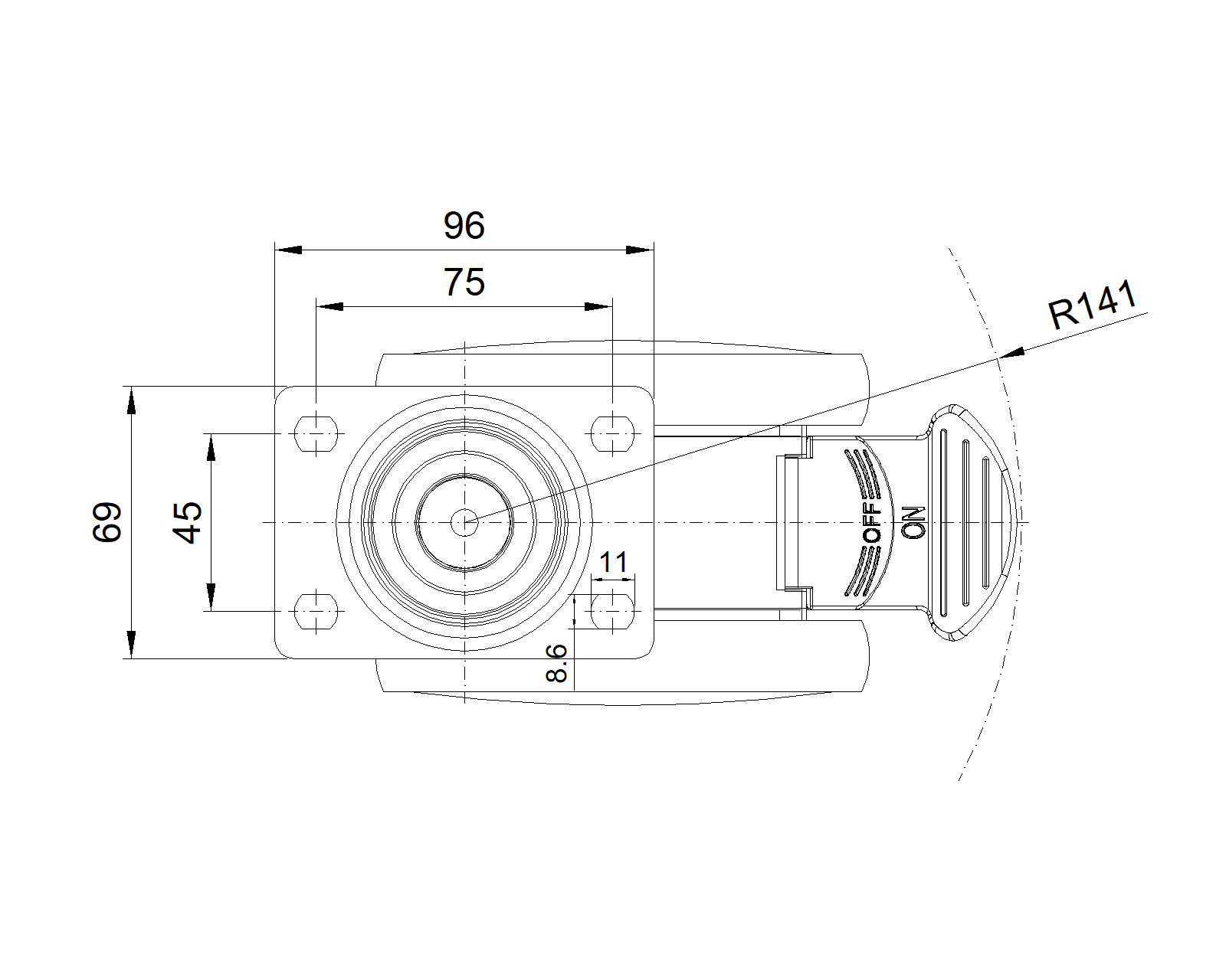 Long Total Brake Casters, 75x45 angled perforated Top Plate