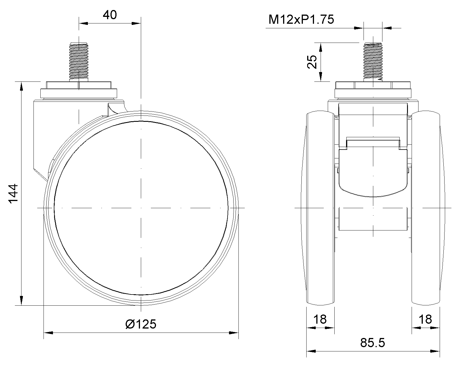 Swivel Casters, Threaded Stem M12x25 White legs made of polyamide reinforced material Rust-proof, Corrosion resistant, Attractive appearance, Economical, and allows for smooth rotation High-Quality Impact-Resistant Polypropylene Wheel Center, High-Quality Reinforced Polypropylene Rubber (TPR) Wheel Tread Dark gray, Bearing—Ball Bearings |