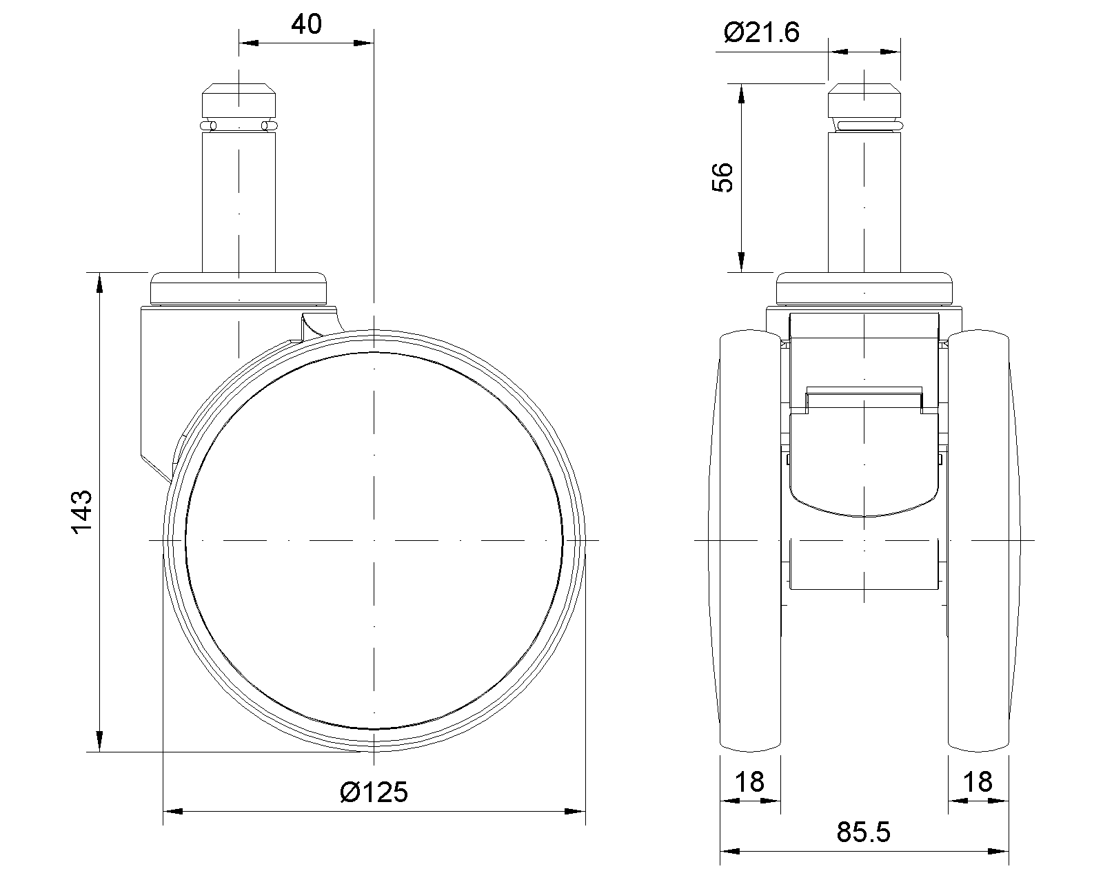 Actuable Casters, mortise-and-tenon Stamping Fork—Ø21.6x56L White legs made of polyamide reinforced material Rust-proof, Corrosion resistant, Attractive appearance, Economical, and allows for Smooth rotation High-Quality Impact-Resistant Polypropylene Wheel Center, High-Quality Reinforced Polypropylene Rubber (TPR) Wheel Tread Dark gray, Bearing—Ball Bearings |