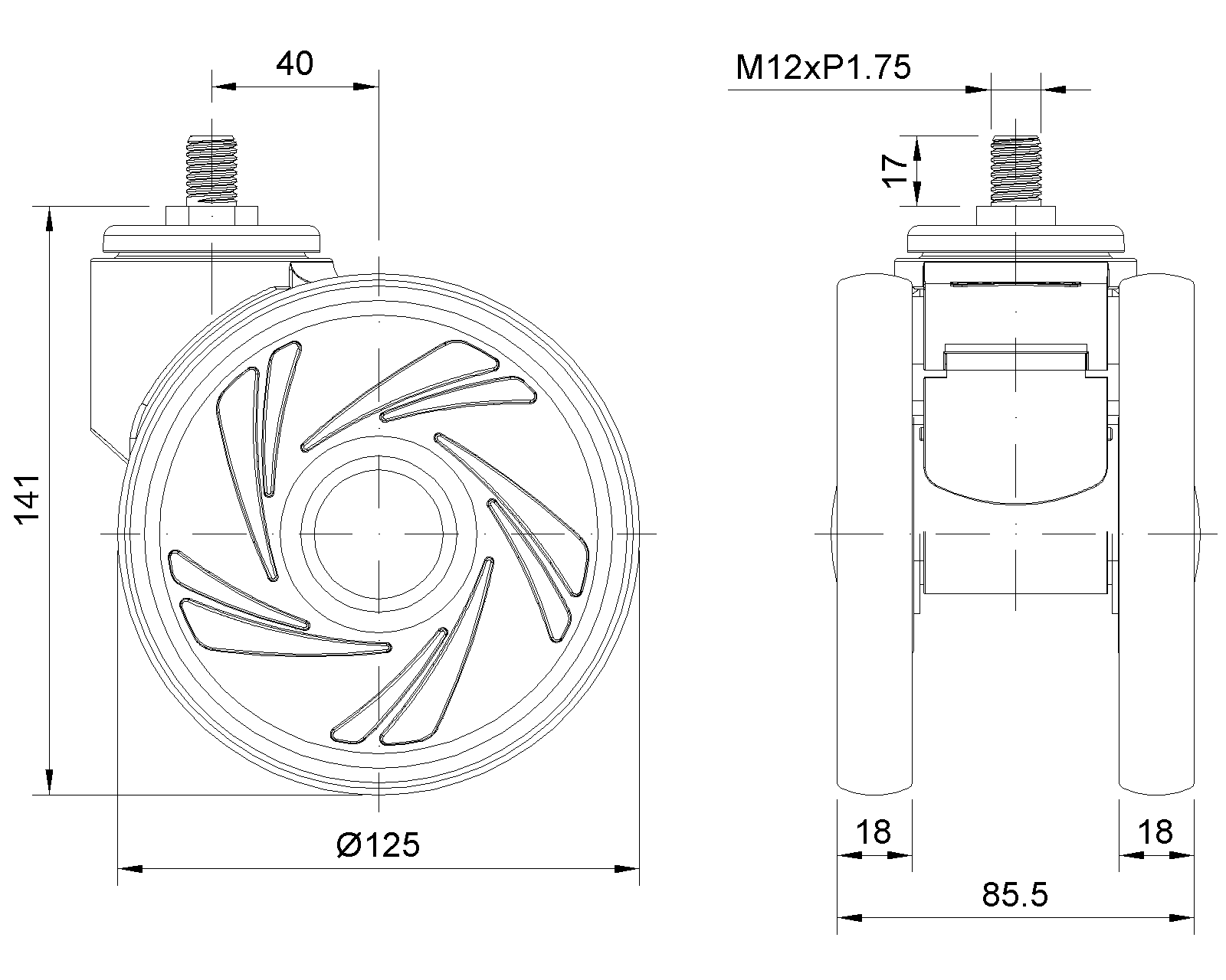 Swivel Casters, Threaded Stem M12x17 White legs made of polyamide reinforced material Rust-proof, Corrosion resistant, Attractive appearance, Economical, and allows for smooth rotation High-Quality Impact-Resistant Polypropylene Wheel Center, High-Quality Reinforced Polypropylene Rubber (TPR) Wheel Tread Dark gray, Bearing—Ball Bearings |
