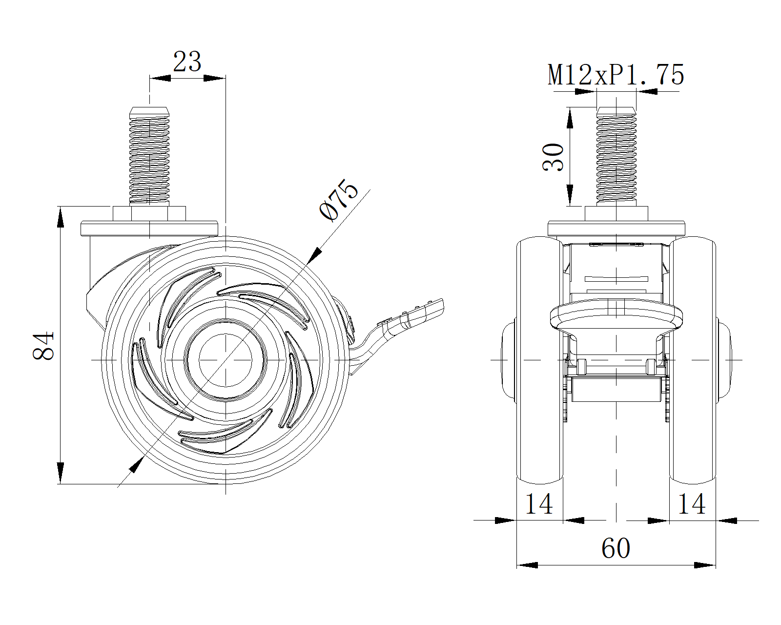 | Wheel tread: Thermoplastic rubber elastomer (TPR) Wheel Center: Made of high-quality impact-resistant polypropylene Drawings are for reference only and may differ from the product |
