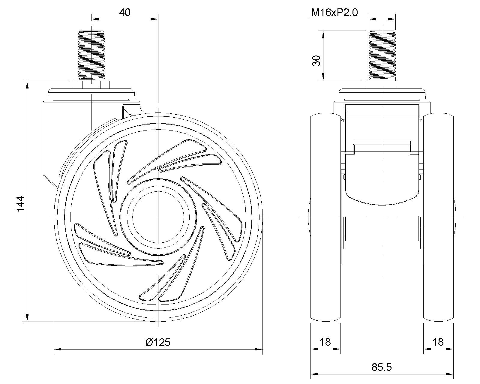 Actuable Casters, Threaded Stem M16x30 Window gray Casters made of polyamide reinforced material Rust-proof, Corrosion resistant, Attractive appearance, Economical, and rotates smoothly High-Quality Impact-Resistant Polypropylene Wheel Center, High-Quality Reinforced Polypropylene Rubber (TPR) Wheel Tread Dark gray, Bearing—Ball Bearings |