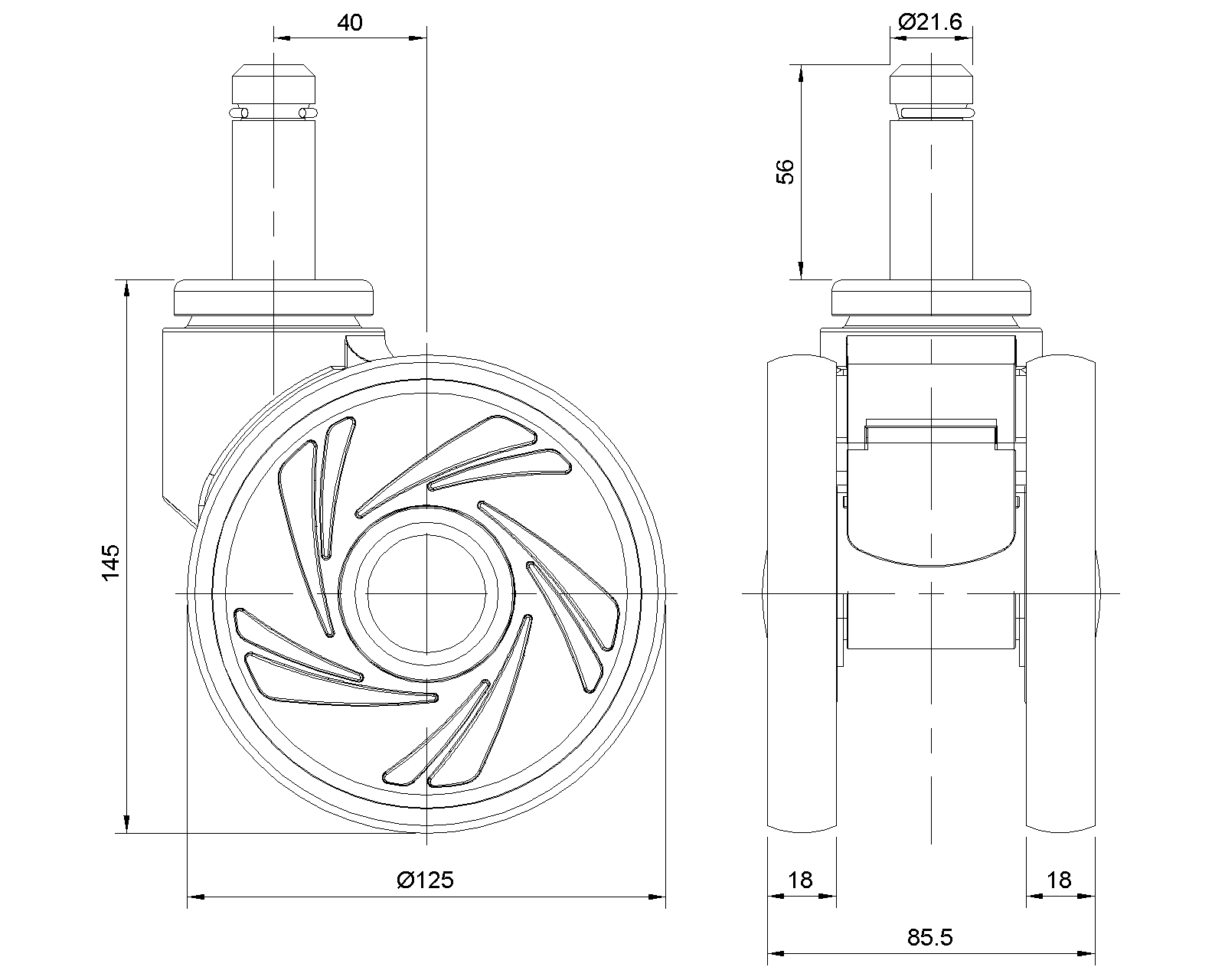 Actuable Casters, mortise-and-tenon Stamping Fork—Ø21.6x56L Window gray legs made of polyamide reinforced material Rust-proof, Corrosion resistant, Attractive appearance, Economical, and allows for Smooth rotation High-Quality Impact-Resistant Polypropylene Wheel Center, High-Quality Reinforced Polypropylene Rubber (TPR) Wheel Tread Dark gray, Bearing—Ball Bearings |