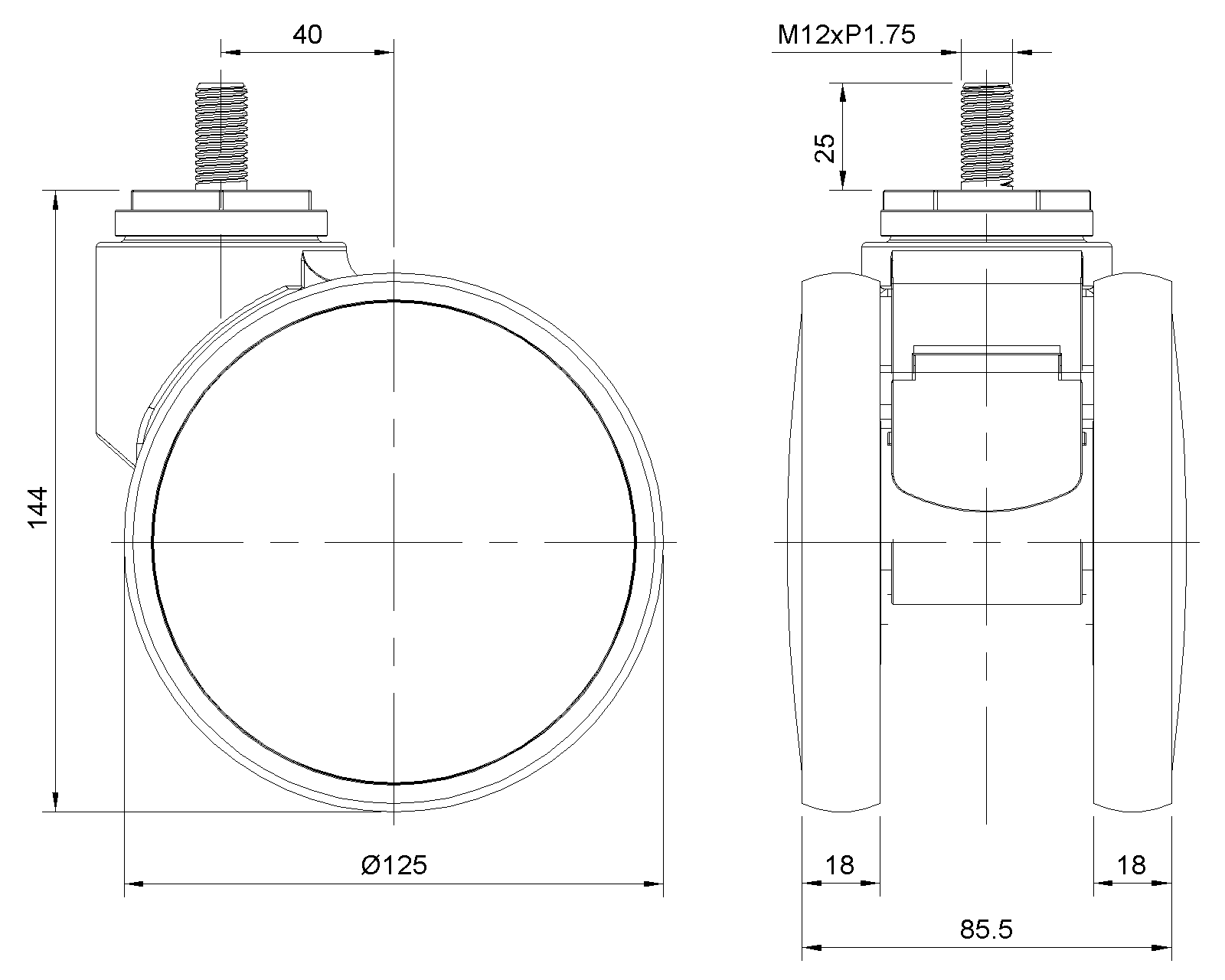 Actual Casters, Threaded Stem M12x25 Window gray Casters made of polyamide reinforced material Rust-proof, Corrosion resistant, Attractive appearance, Economical, and allows for smooth rotation High-Quality Impact-Resistant Polypropylene Wheel Center, High-Quality Reinforced Polypropylene Rubber (TPR) Wheel Tread Dark gray, Bearing—Ball Bearings |