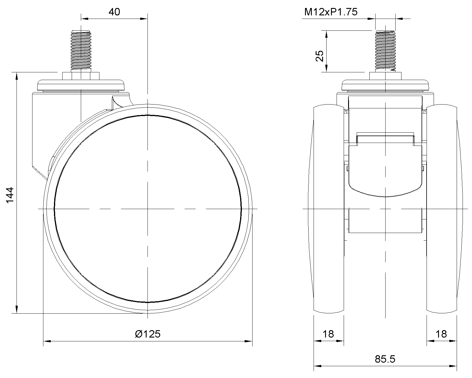 Actual Casters, Threaded Stem M12x25 Window gray Casters made of polyamide reinforced material Rust-proof, Corrosion resistant, Attractive appearance, Economical, and allows for smooth rotation High-Quality Impact-Resistant Polypropylene Wheel Center, High-Quality Reinforced Polypropylene Rubber (TPR) Wheel Tread Dark gray, Bearing—Ball Bearings |