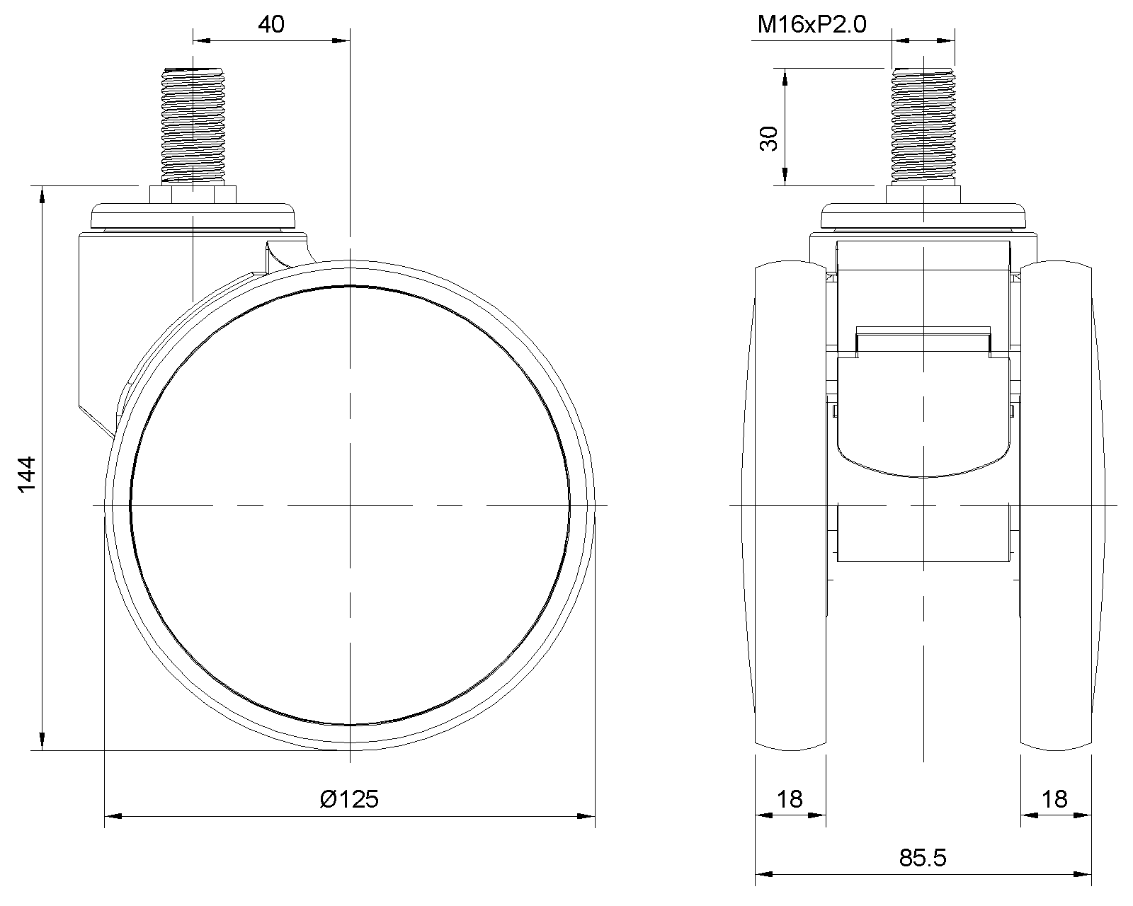 Actuable Casters, Threaded Stem M16x30 Window gray Casters made of polyamide reinforced material Rust-proof, Corrosion resistant, Attractive appearance, Economical, and rotates smoothly High-Quality Impact-Resistant Polypropylene Wheel Center, High-Quality Reinforced Polypropylene Rubber (TPR) Wheel Tread Dark gray, Bearing—Ball Bearings |